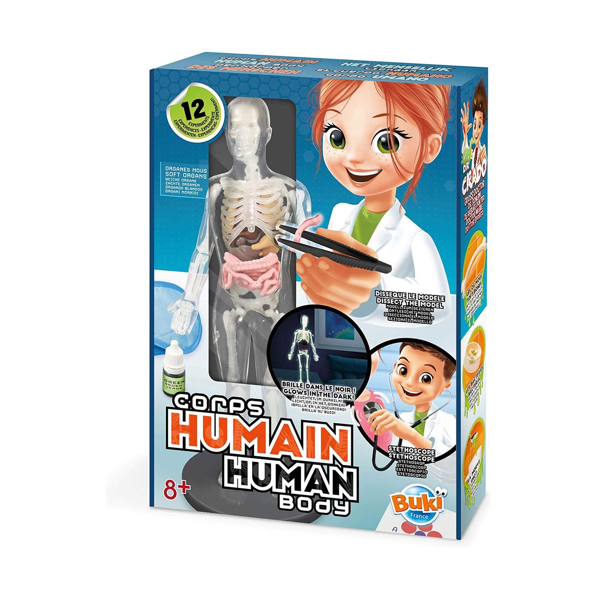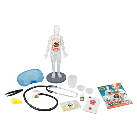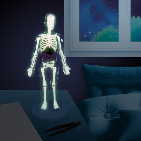 Включен е модел на човешко тяло с меки органи за дисекция и фосфоресциращи кости;
