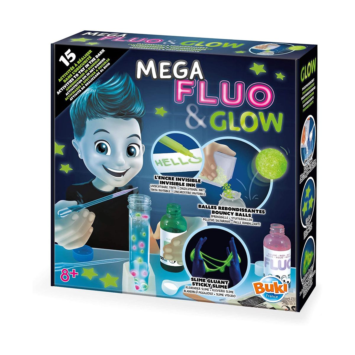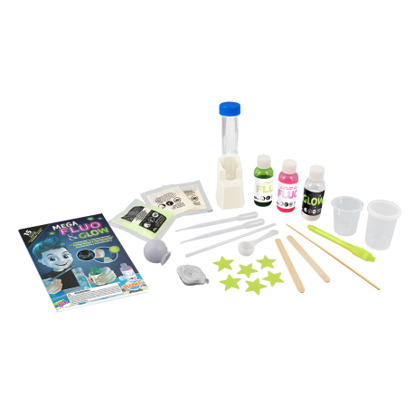 Комплект за извършване на 15 дейности в тъмното за откриване на флуоресцентни цветове и фосфоресциращи предмети;