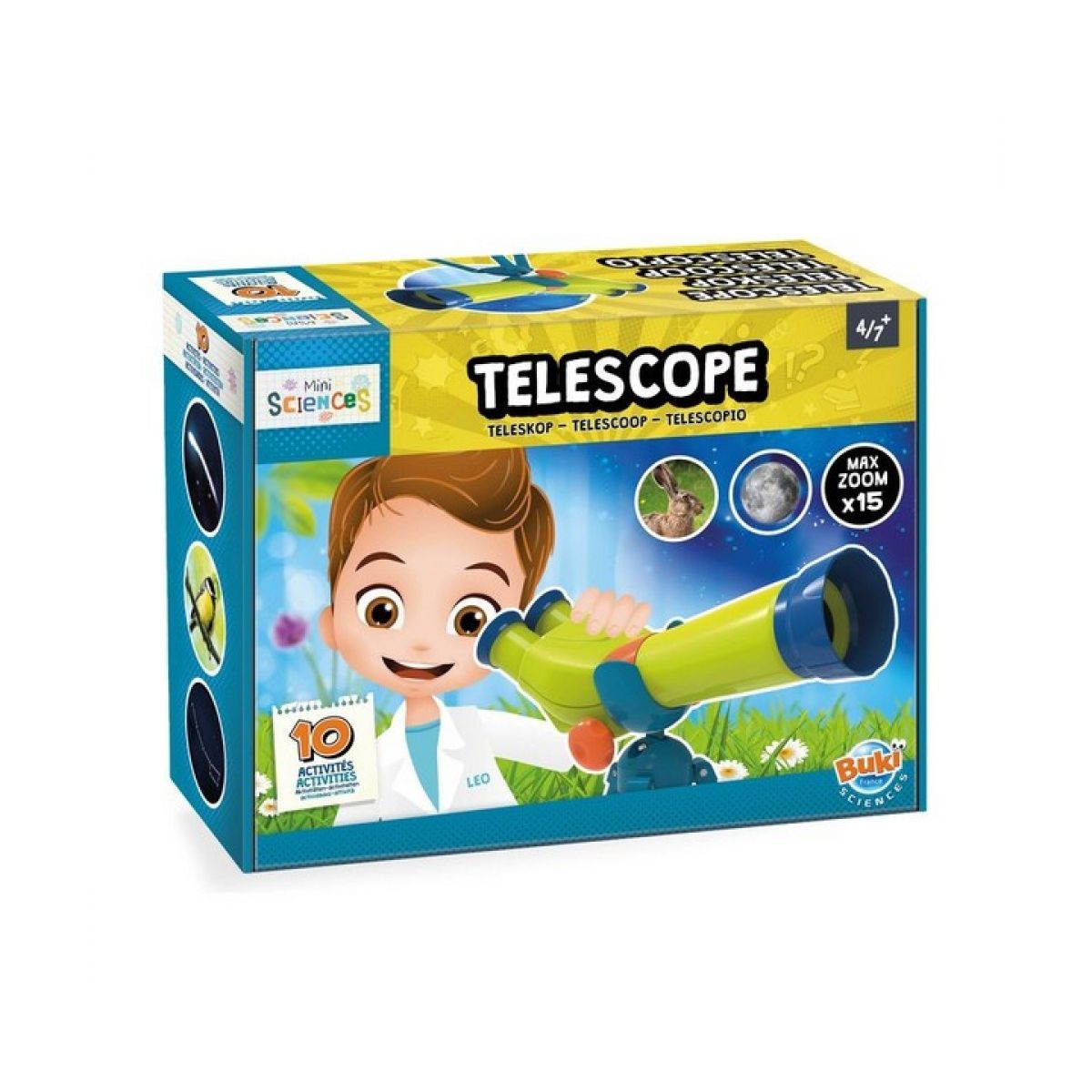 Съдържа аксесоари, пригодени за най-малките: увеличение до X15, диаметър 35 мм и триножник 30 см;