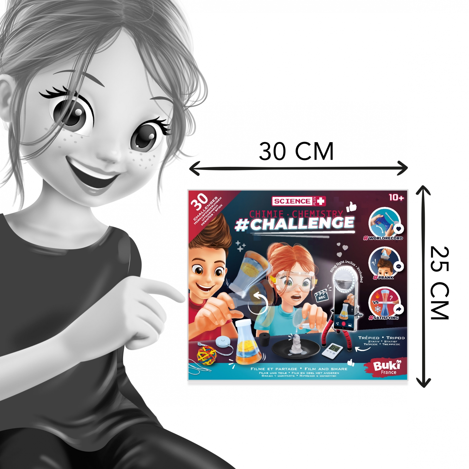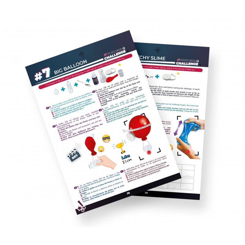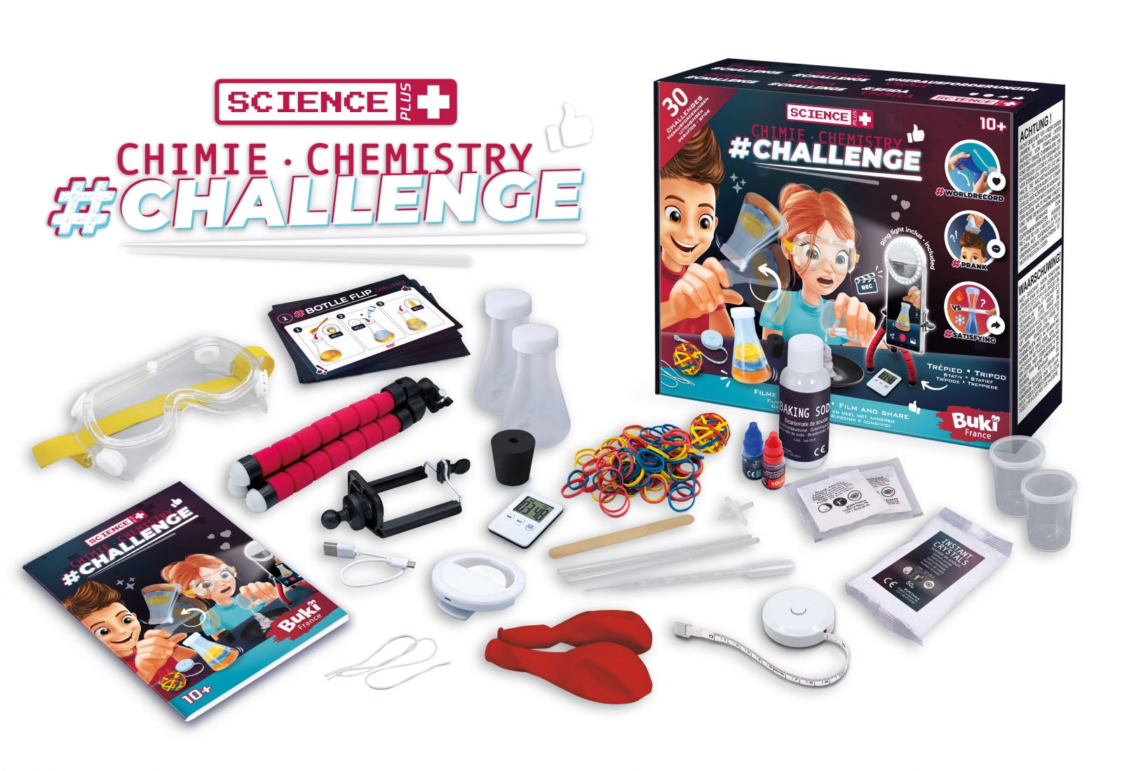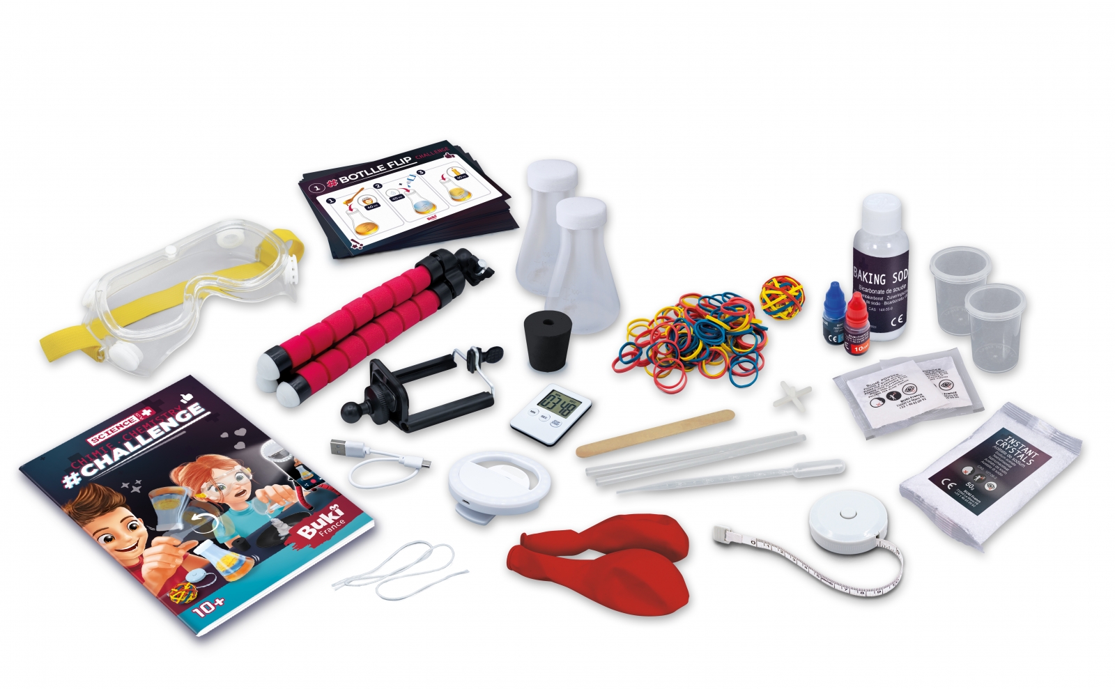 • Комплектът включва: 1 статив, 1 светлинен пръстен, 1 USB кабел, 1 таймер, 1 ролетка, 3 сламки, 2 балона, 2 чаши, 100 ластика, 2 флакона, 1 пипета, 1 червена боя (10 ml), 1 синя боя ( 10 мл), 1 натриев ацетат (50 г), 2 пакетчета слуз на прах, 1 сода бикарбонат (75 г), 1 блендер, 30 карти с предизвикателства, защитни очила, 1 продупчена капачка, 1 еластичен държач за топка, 1 връв, 1 прозрачна карта и 1 брошура;