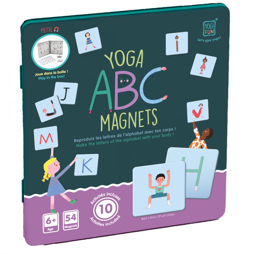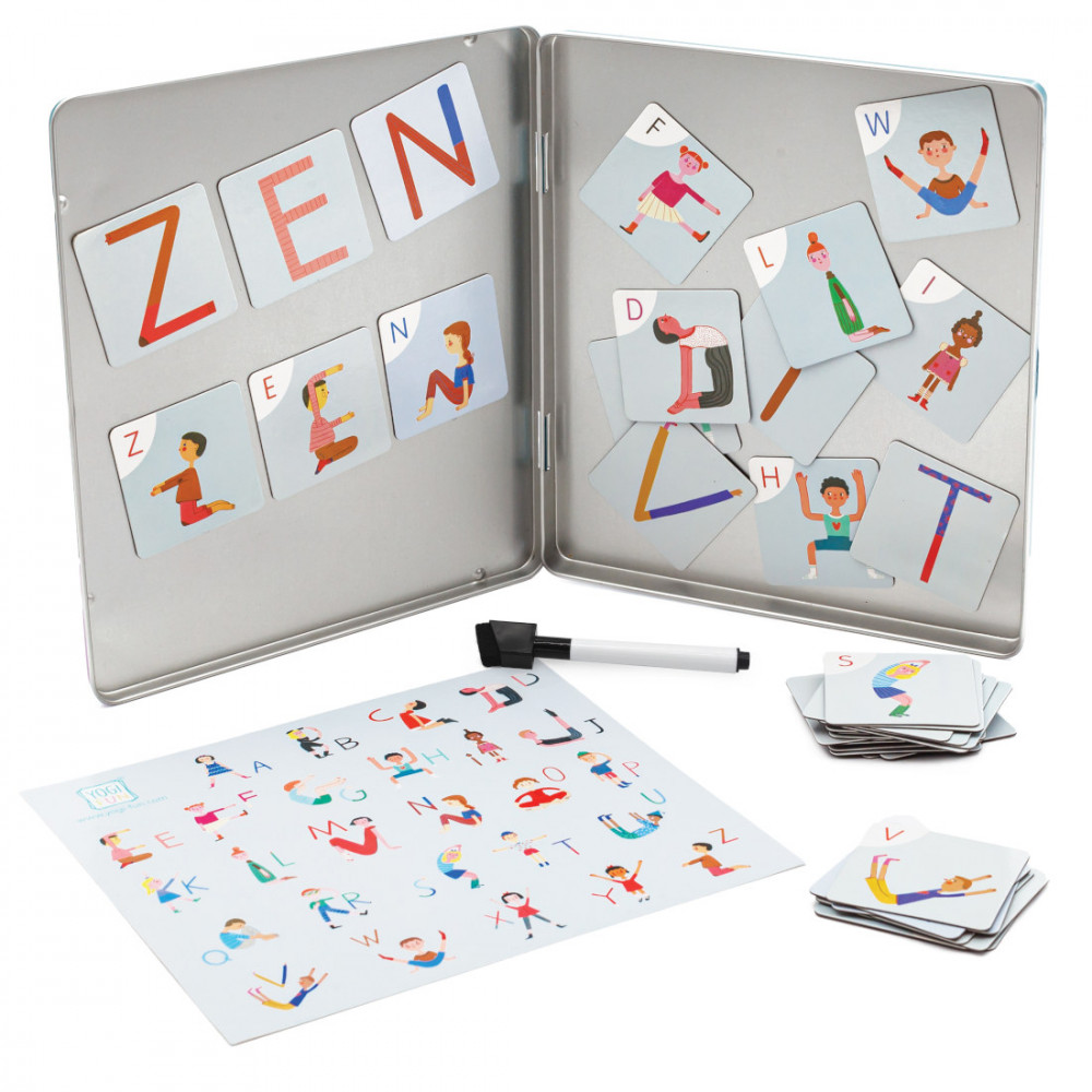 Комплектът съдържа: 56 части - 26 букви, 26 съответстващи пози, 2 празни магнита с изтриваем маркер и хартиен грунд;