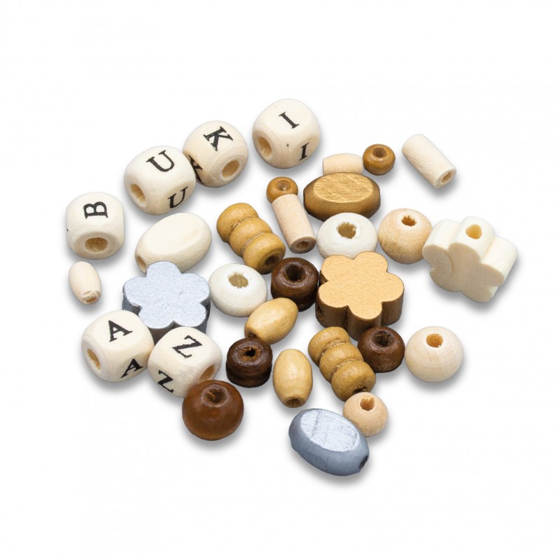 Има мъниста от естествено дърво, златни и сребърни цветове и дори някои с букви върху тях;