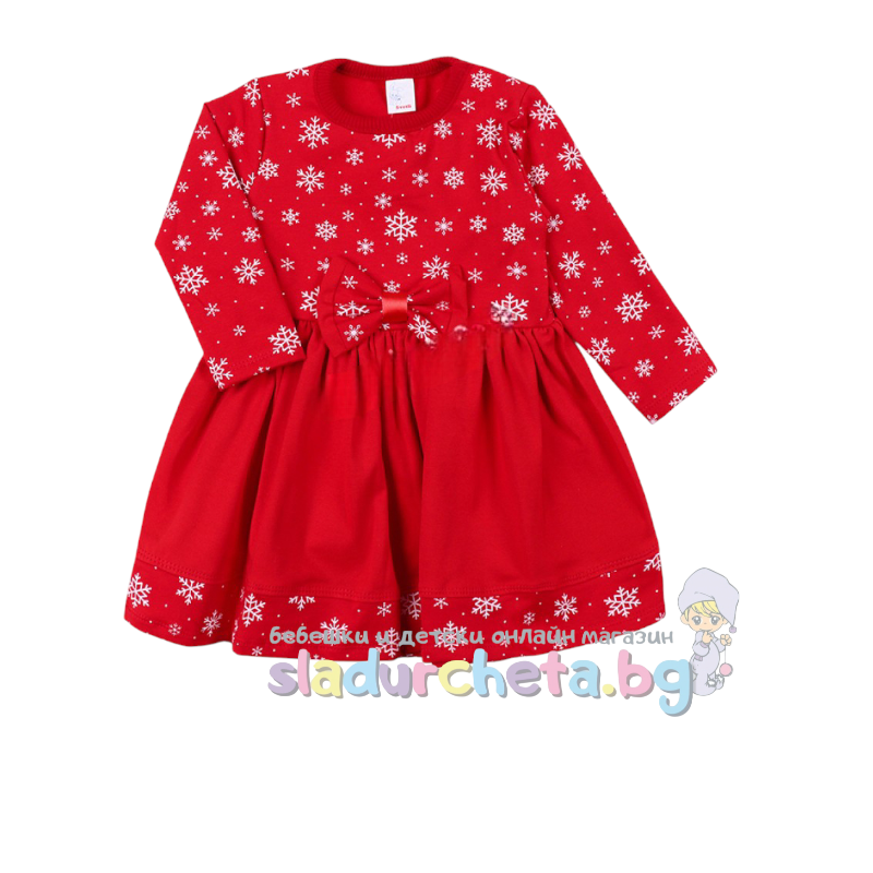 Роклята е с дълъг ръкав в червен цвят с щампа на снежинки и широка долна част;