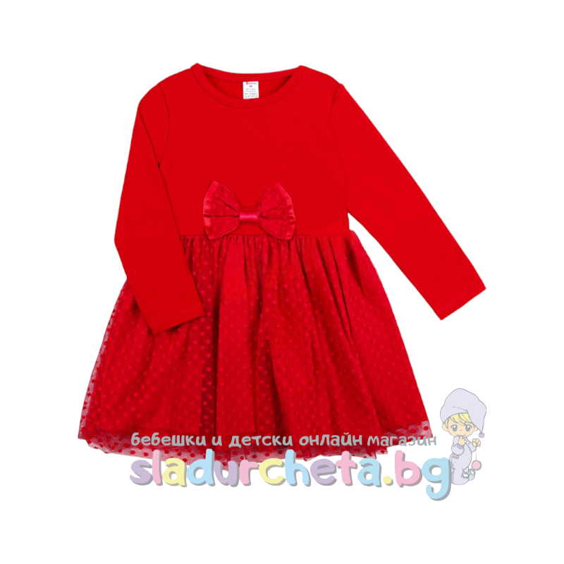 Роклята е с дълъг ръкав в червен цвят с щампа на точки и тюл в долната част;