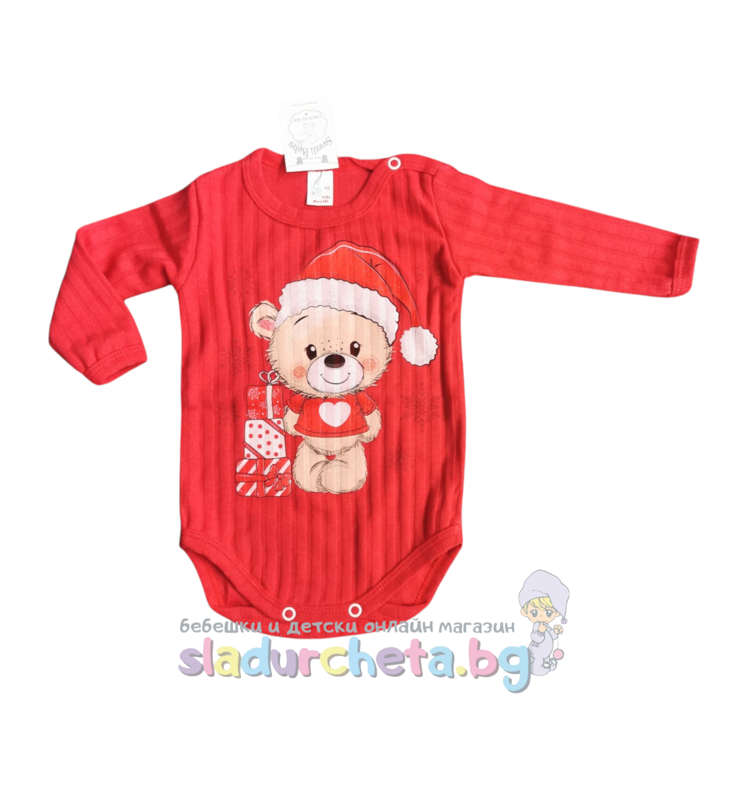 • Бодито е с дълъг ръкав в червен цвят с коледна апликация;