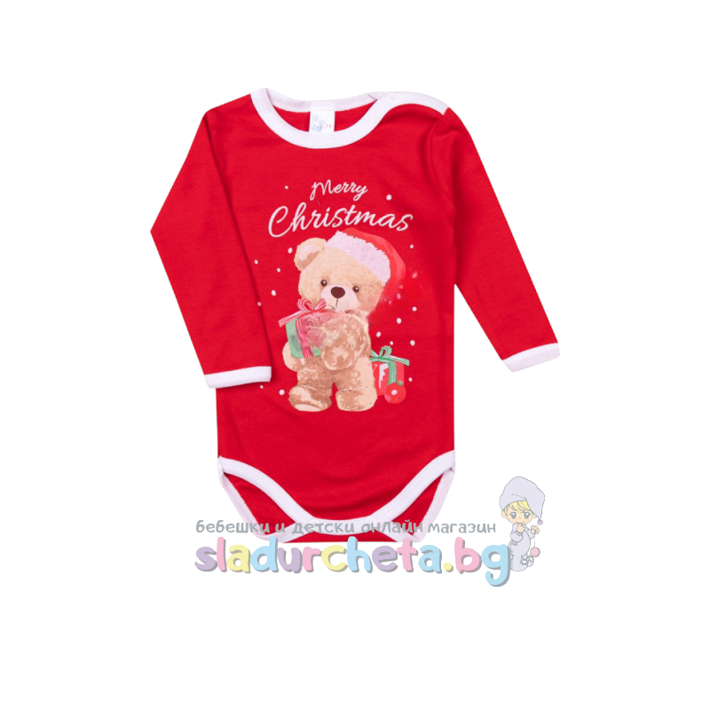 • Бодито е с дълъг ръкав в червен цвят с коледна апликация;