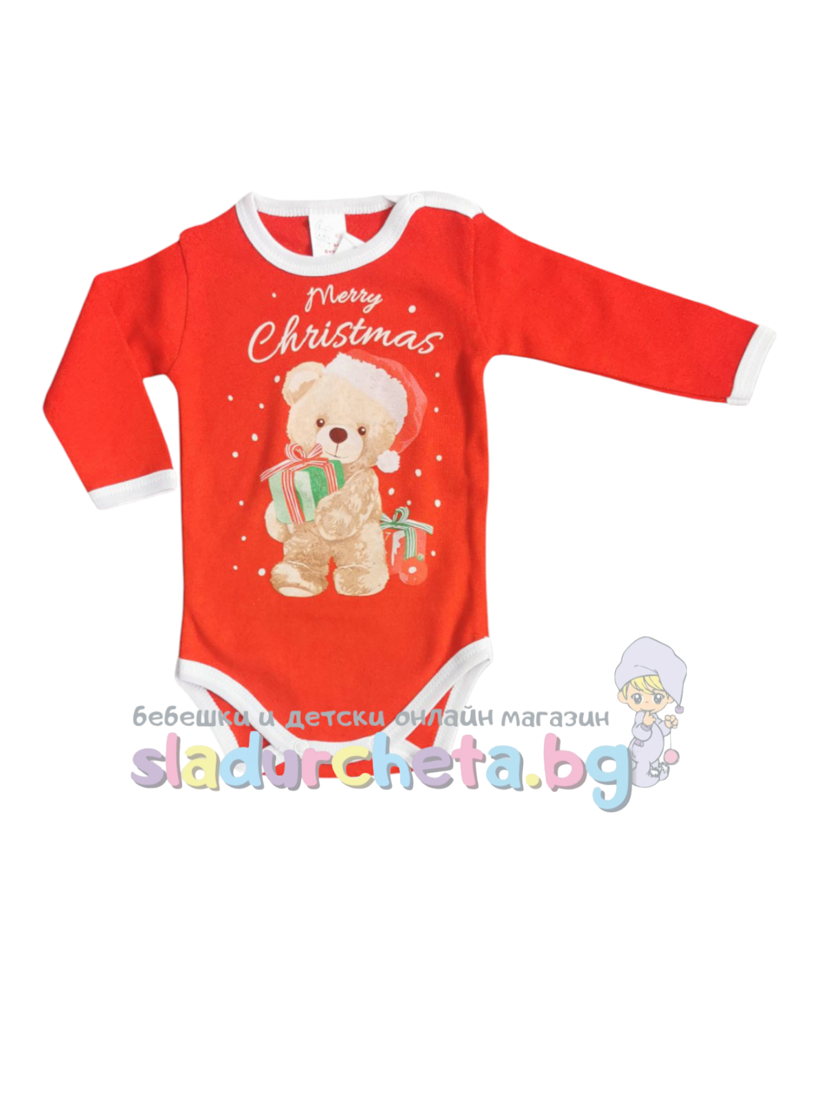 • Бодито е с дълъг ръкав в червен цвят с коледна апликация;