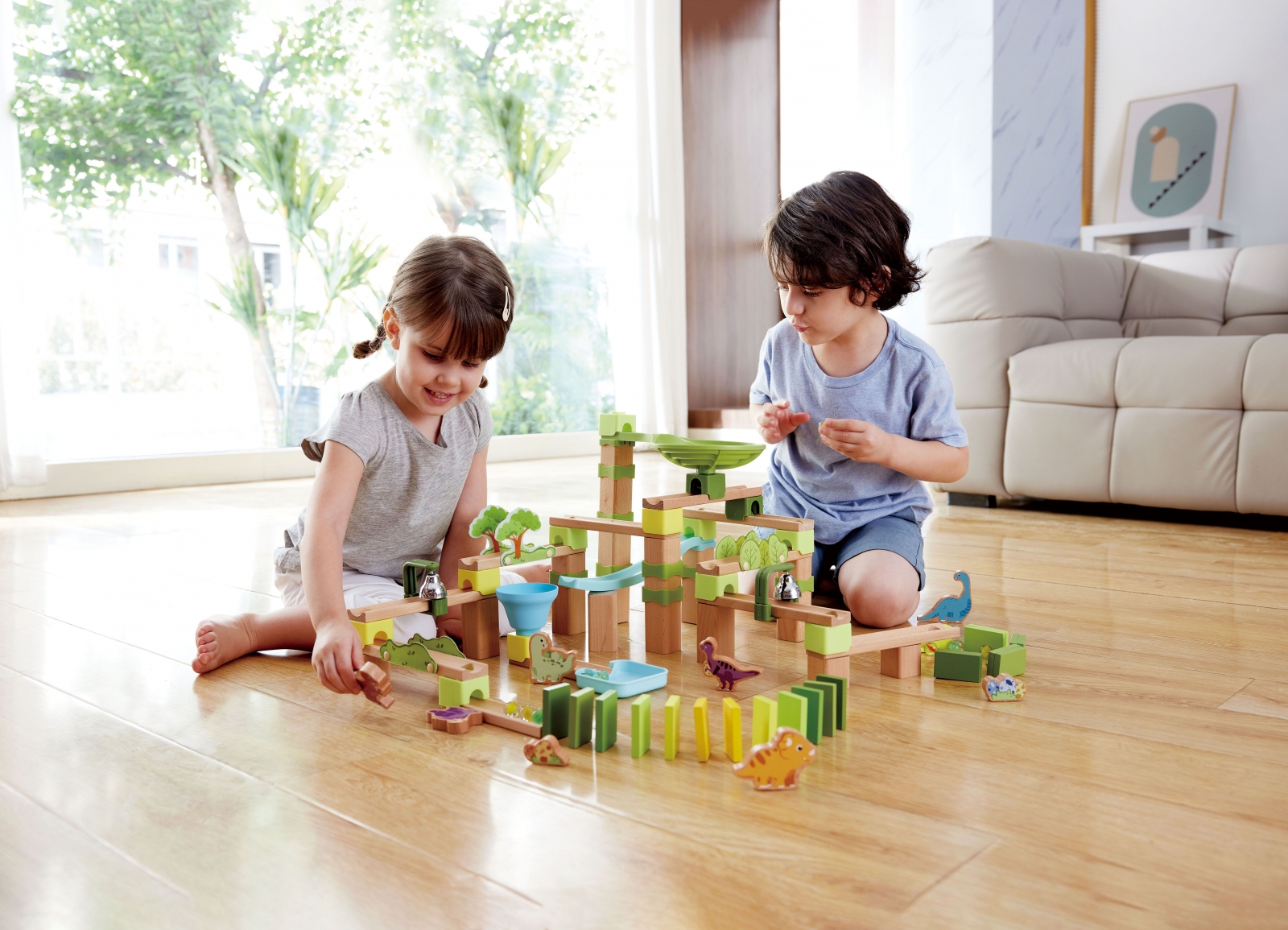 Комплектът включва: цветни, дървени блокчета, спирали, пързалки, топчета, звунец, както и дървени динозаври;