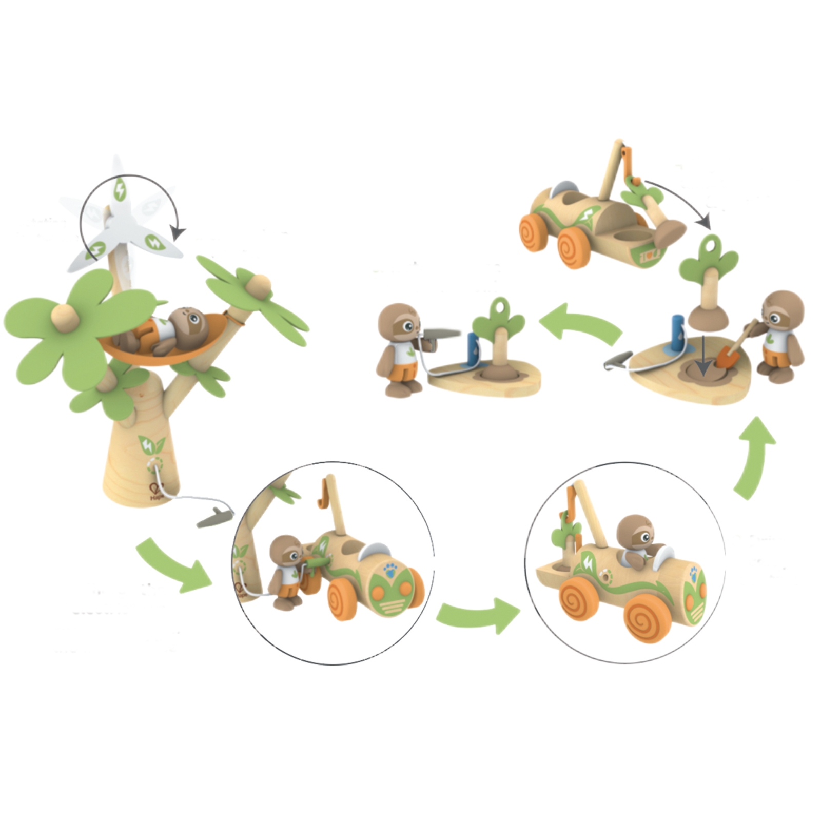 Водачът на ленивец може да се отпусне на хамака, след това да се качи в колата, да измъкне дърво, да изкопае дупка с лопата, да посади дървото и да го полее с маркуч;