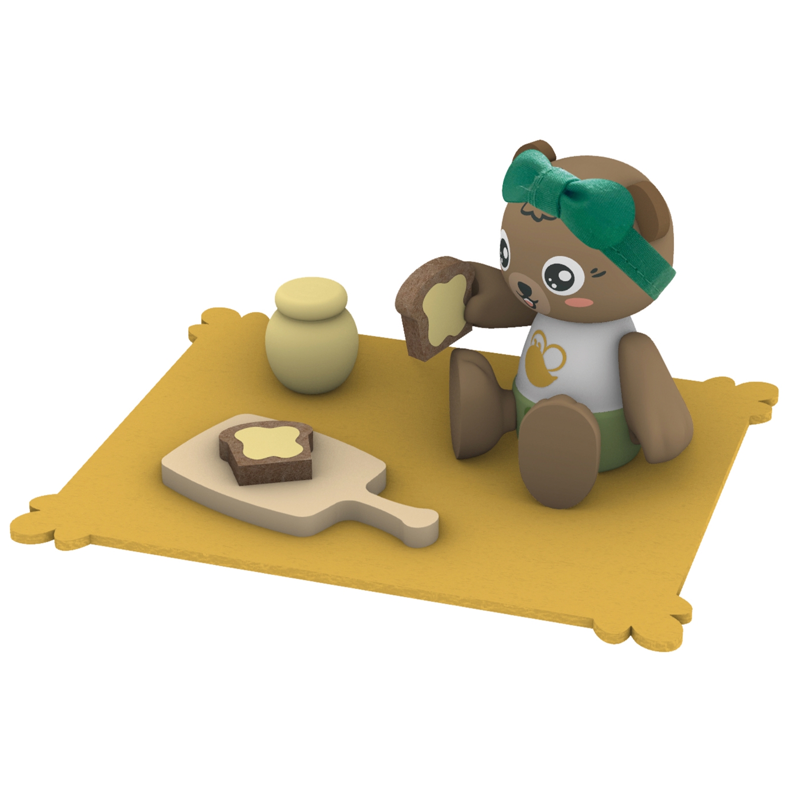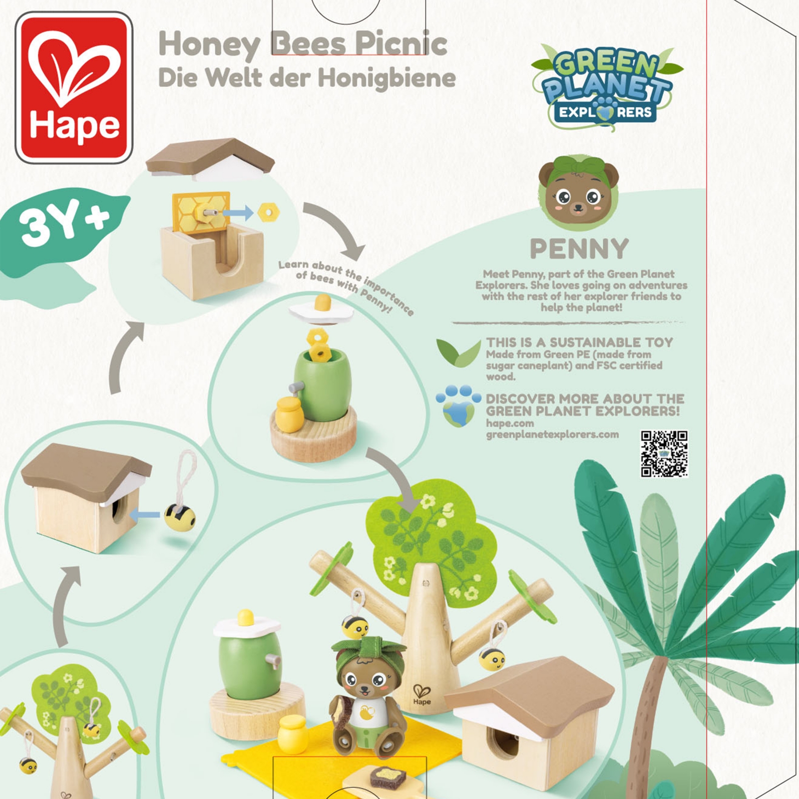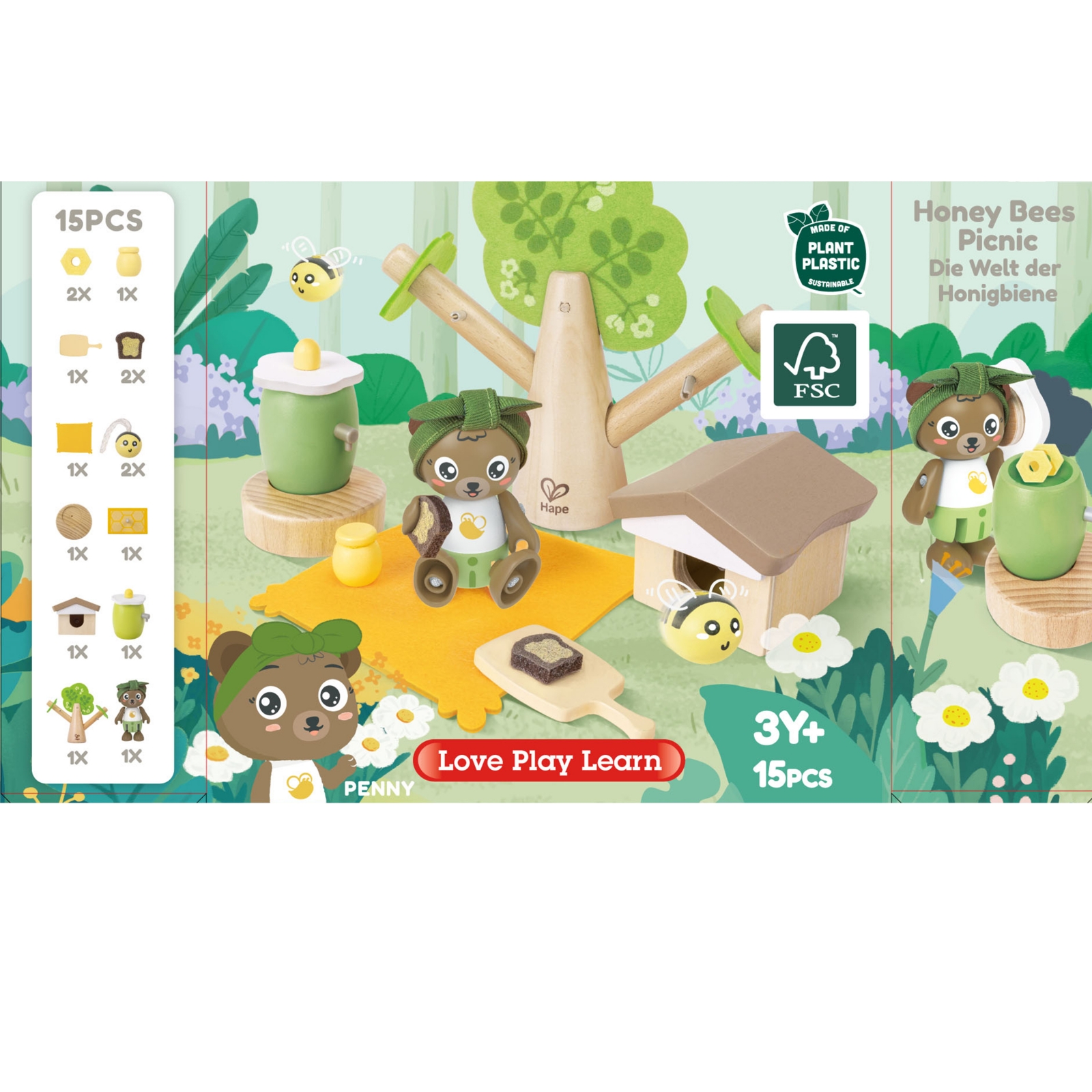Комплектът включва: две пчели, дърво, платформа, дозатор за мед, буркан с мед, рамка с пчелна пита, две парчета пчелна пита, две парчета хляб, една тава за препечен хляб, един килим и една фигурка;