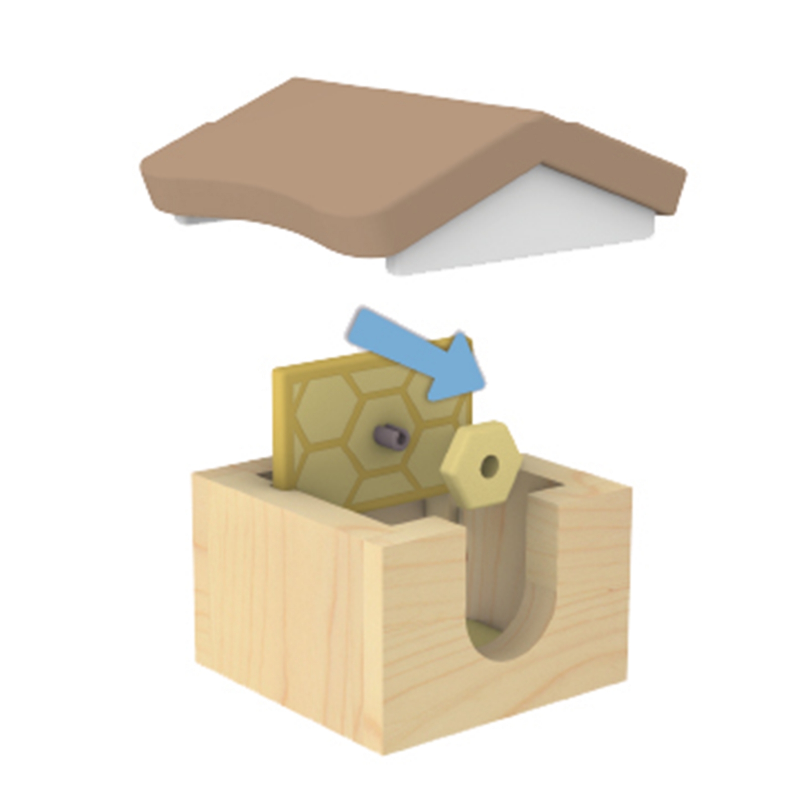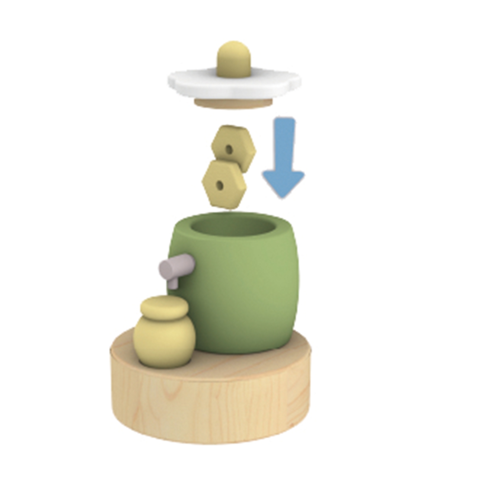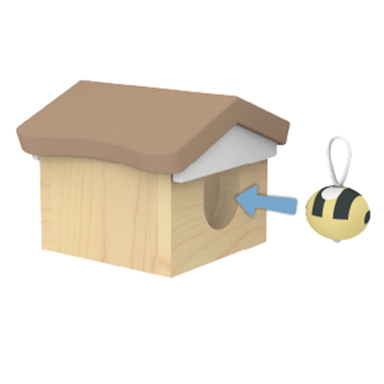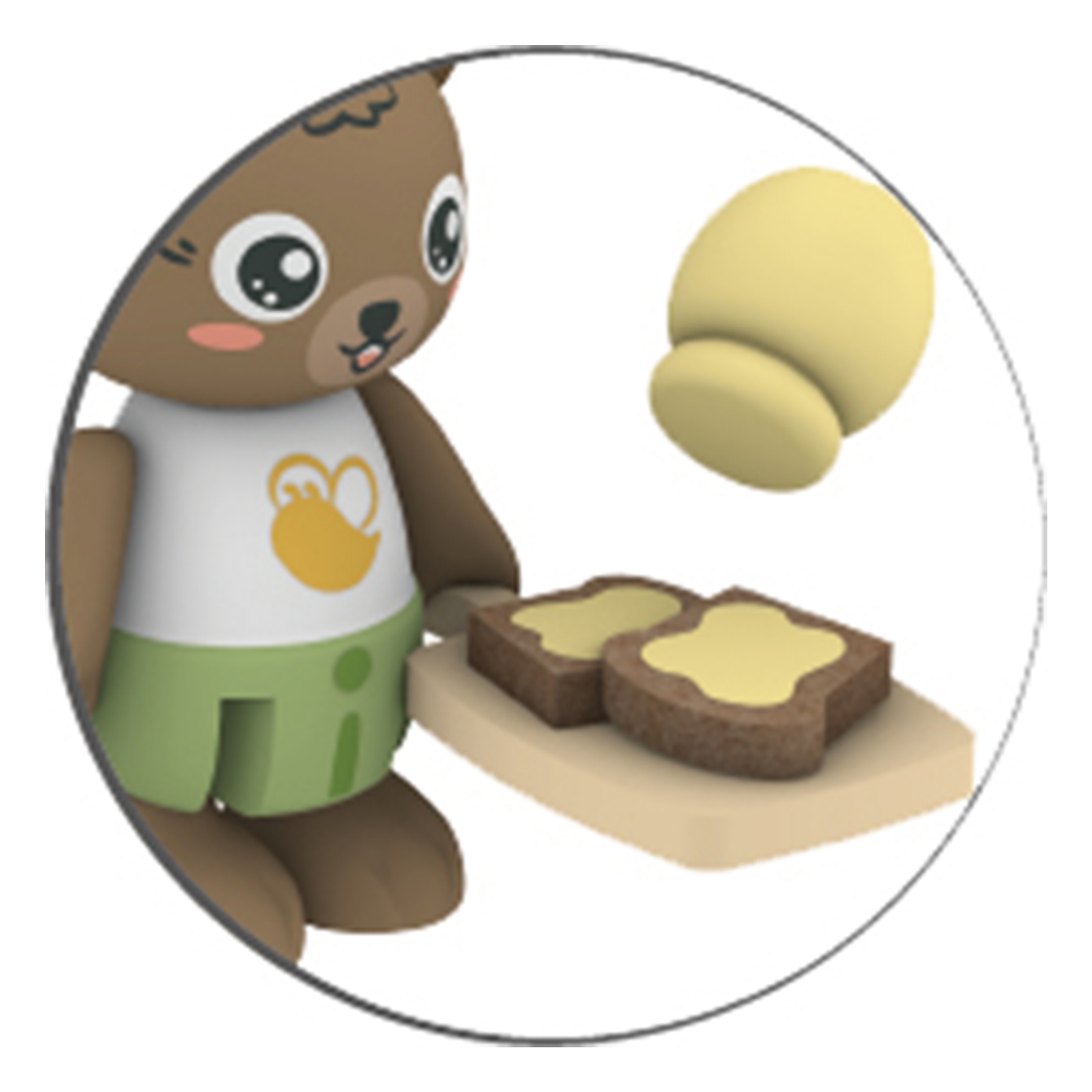 Комплектът включва: две пчели, дърво, платформа, дозатор за мед, буркан с мед, рамка с пчелна пита, две парчета пчелна пита, две парчета хляб, една тава за препечен хляб, един килим и една фигурка;