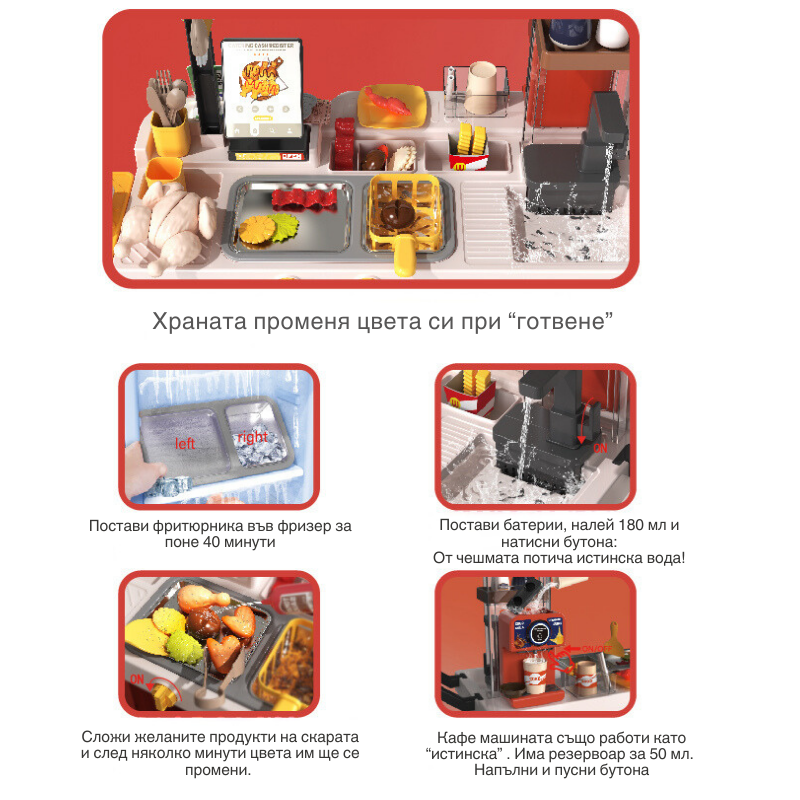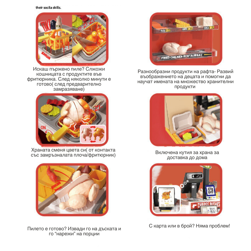 • Децата могат да мият храна, плодове и съдове, приготвят храна и напитки и изпълнят поръчката в кутия за вкъщи или на място;