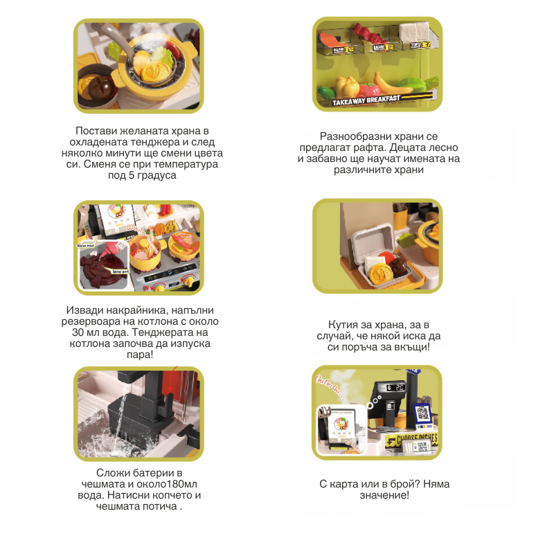 • Децата могат да мият храна, плодове и съдове, приготвят храна и напитки и изпълнят поръчката в кутия за вкъщи или на място;