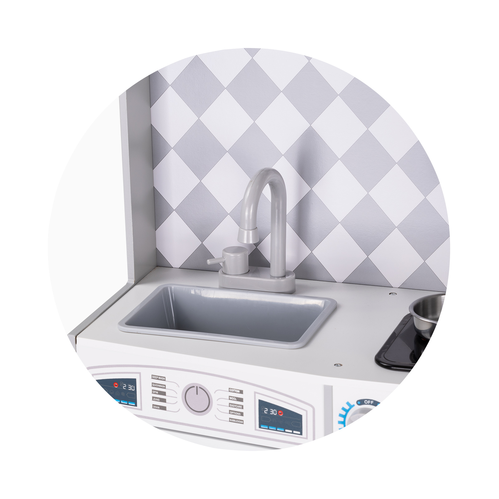 Оборудвано с реалистични уреди: мивка, машина за лед, съдомиялна машина, плоча за готвене със звук и светлина, комплект от 5 кухненски прибори и тенджери;