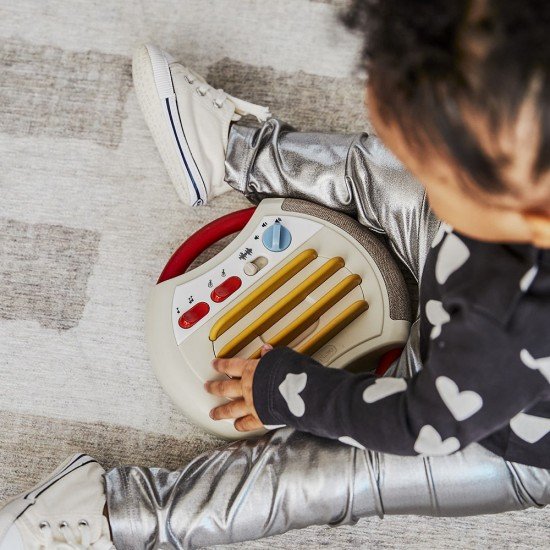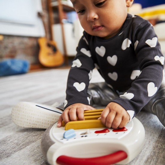 4 струни, които имитират истинското изживяване от свирене на китара като същевременно стимулират координацията и укрепват фините двигателни умения на детето;