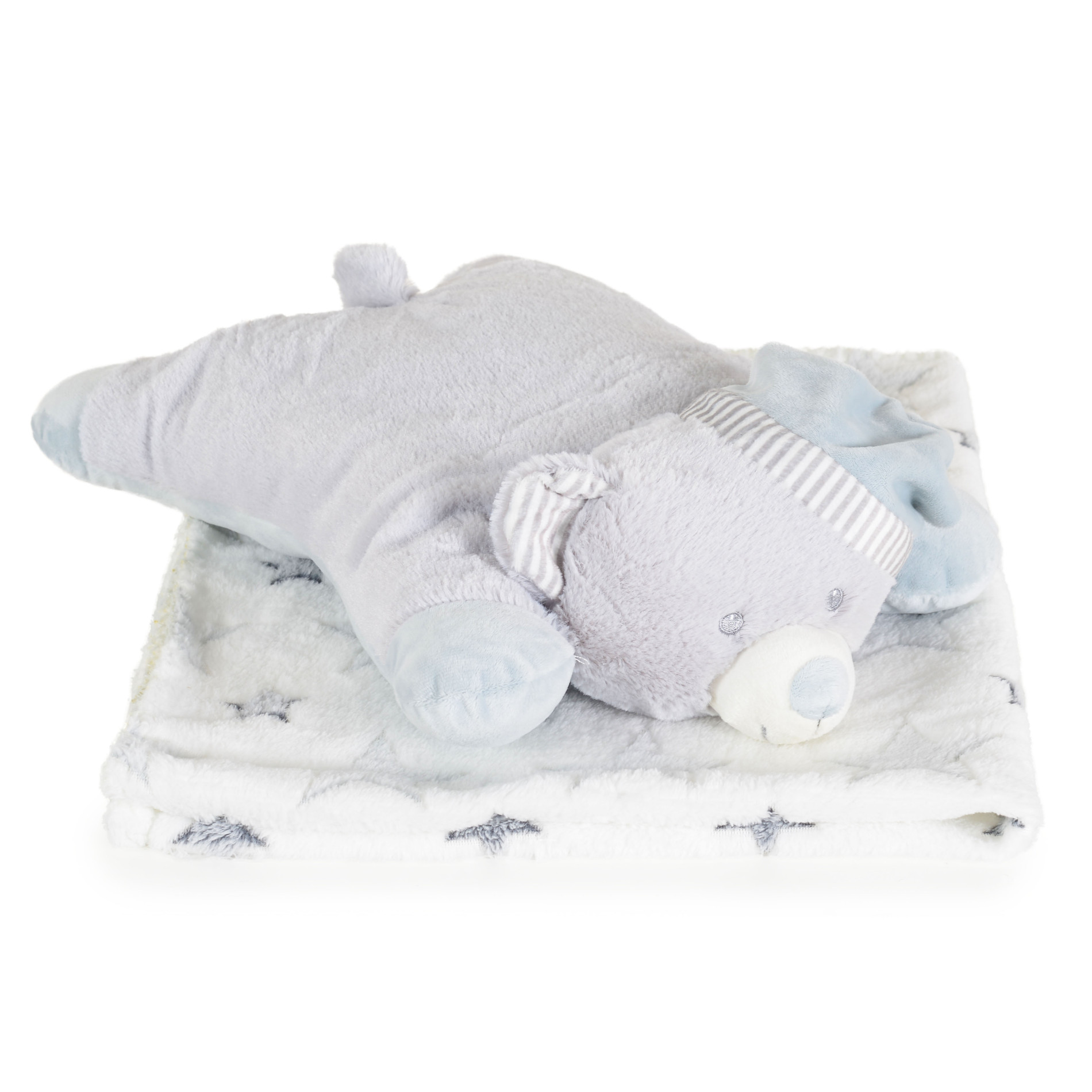 Прекрасен комплект, включващ мека възглавничка във формата на сладко мече с размери 40x38 см и уютно одеяло с размери 75x90 см;