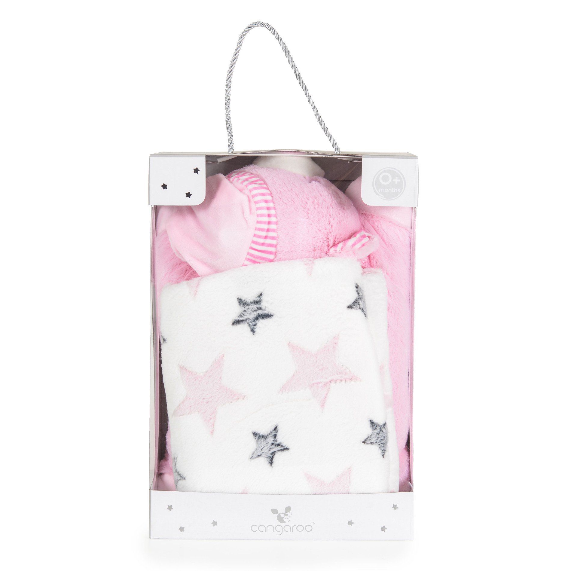 Прекрасен комплект, включващ мека възглавничка във формата на сладко мече с размери 40x38 см и уютно одеяло с размери 75x90 см;