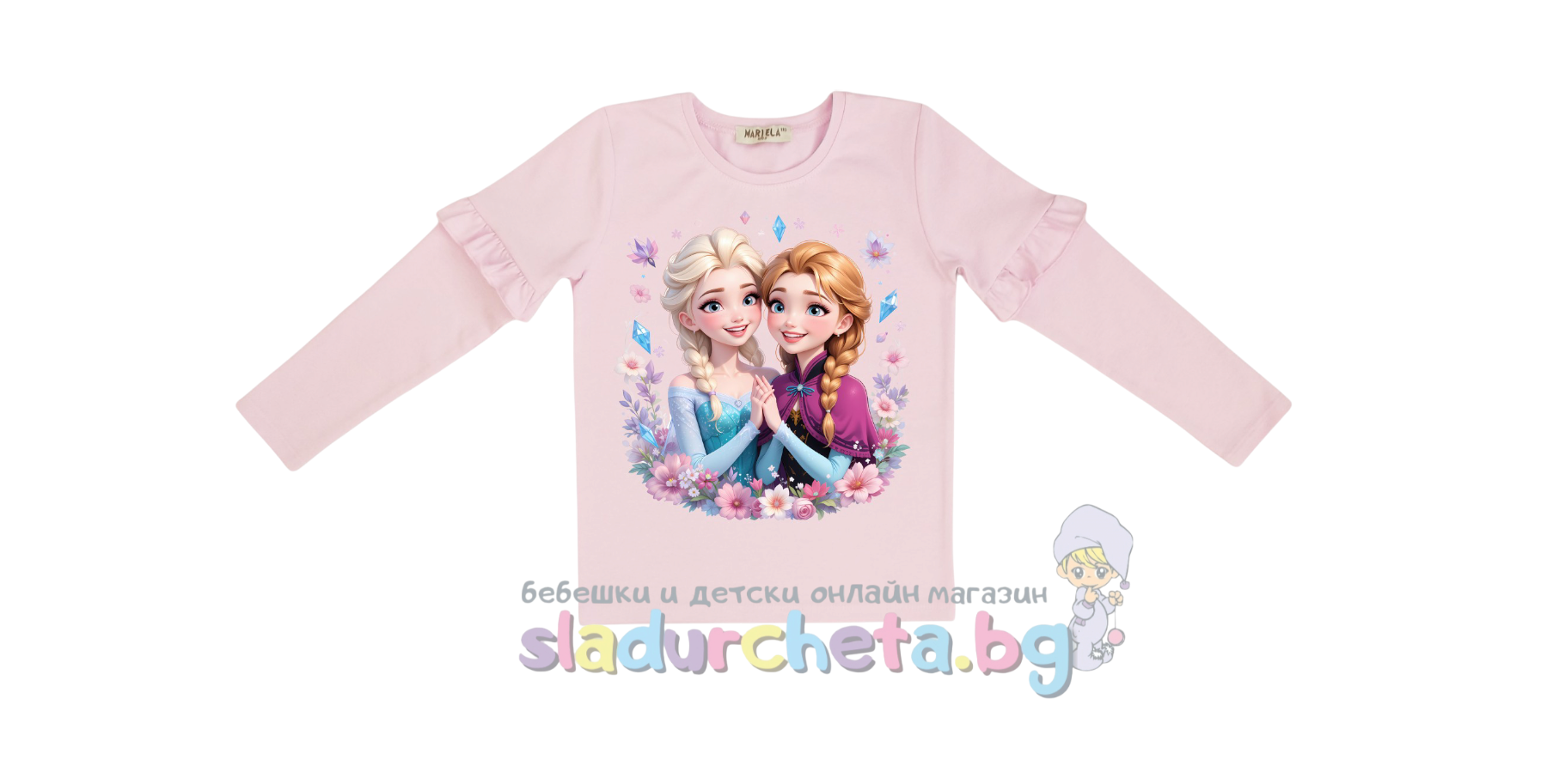 Блузата е с дълъг ръкав в цвят пудра с цветна апликация на Елза и Анна;