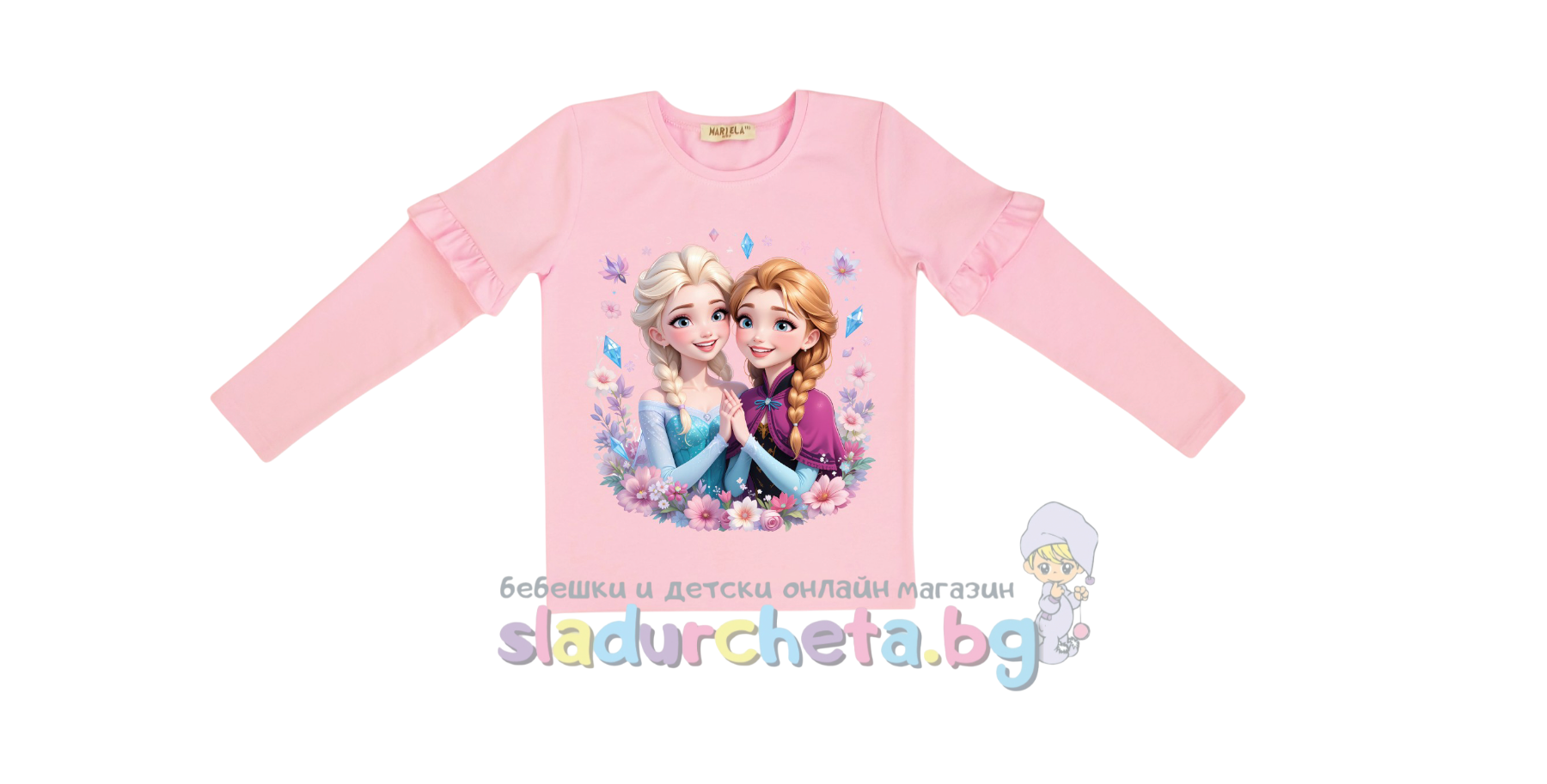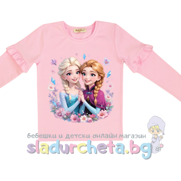 Блузата е с дълъг ръкав в розов цвят с цветна апликация на Елза и Анна;