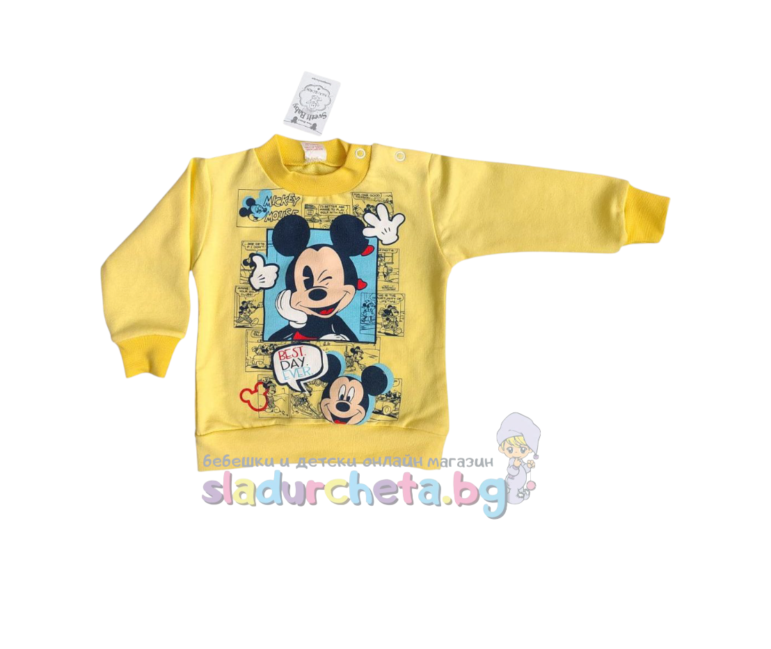 Блузата е с дълъг ръкав в жълт цвят и цветна апликация на Мики Маус;