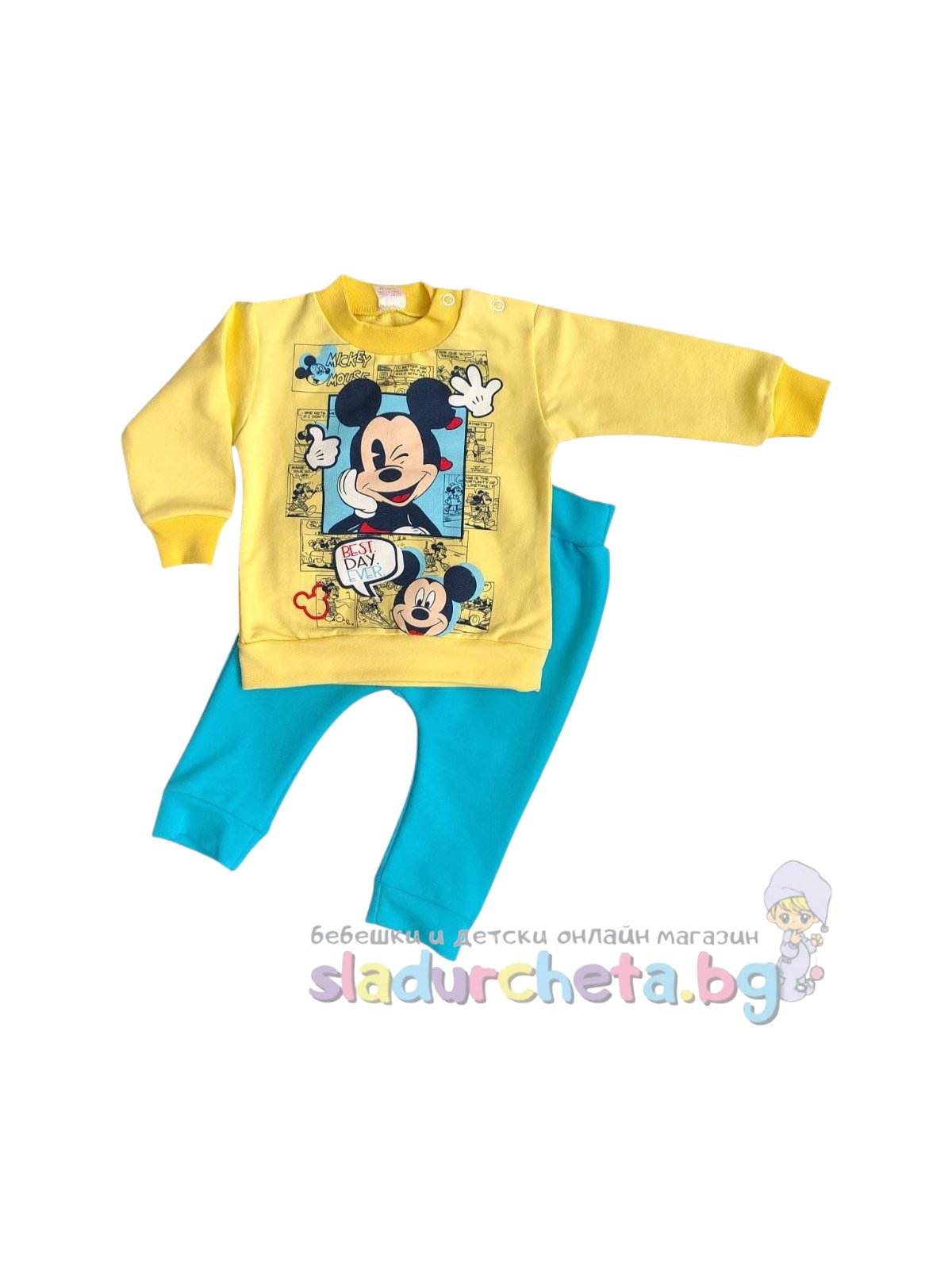 Блузата е с дълъг ръкав в жълт цвят и цветна апликация на Мики Маус;