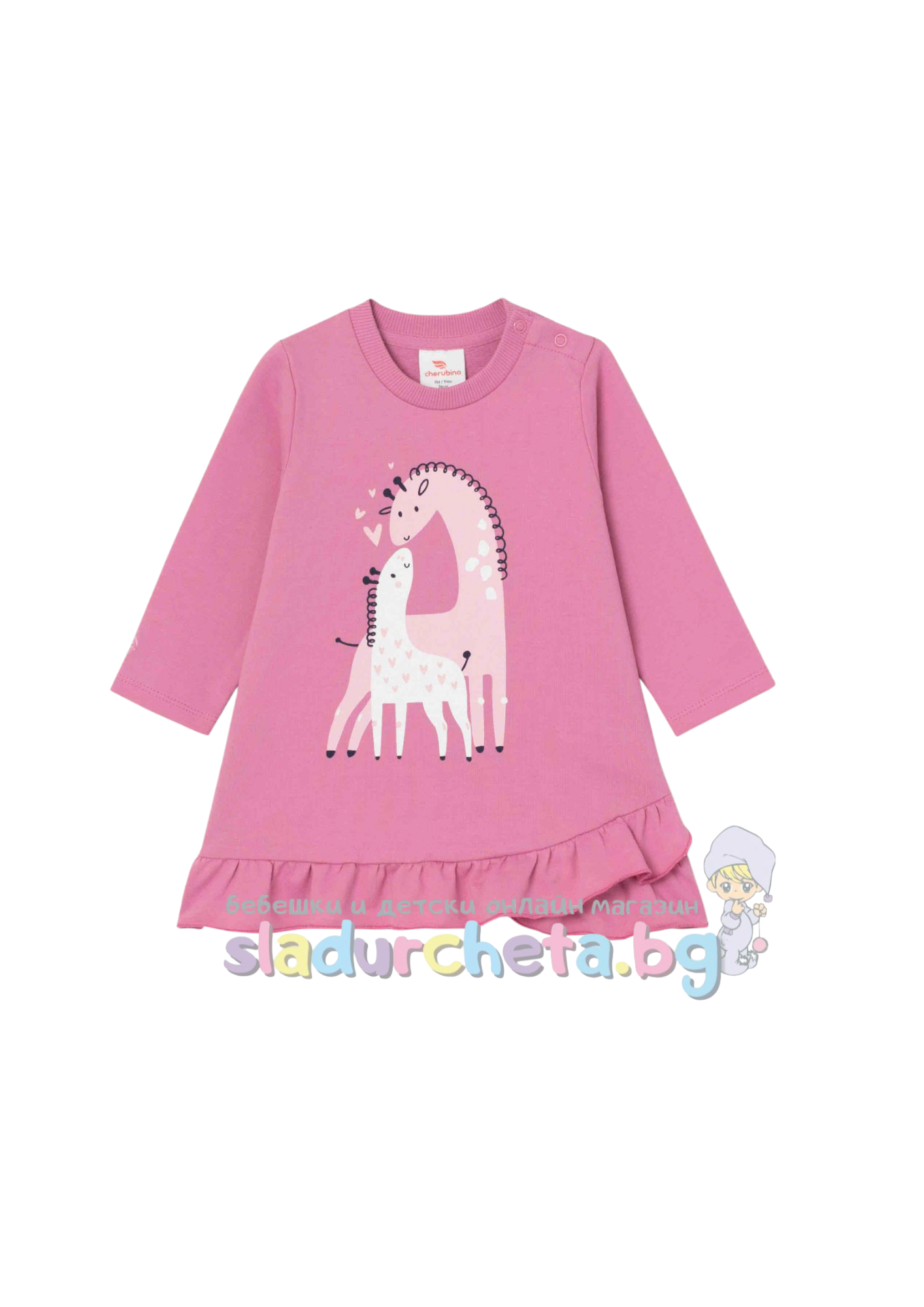 Туниката е с дълъг ръкав в розов цвят с апликация и къдрави акценти;
