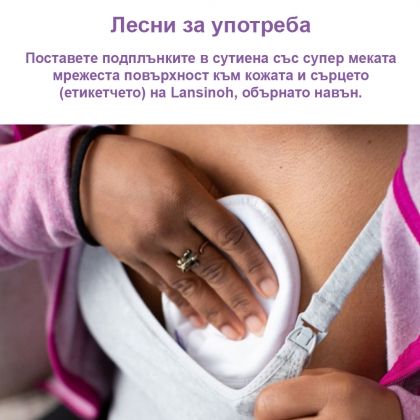 Лесни за употреба: Поставете подплънките в сутиена със супер меката мрежеста повърхност към кожата а сърцето(етикетчето) на Lansinoh, от външната страна. Подменяйте подплънката когато усетите че е напоена с кърма и изперете в пералня машина след всяка употреба. За най-добри резултати винаги поставяйте подплънките в предоставената торбичка когато ги перете.