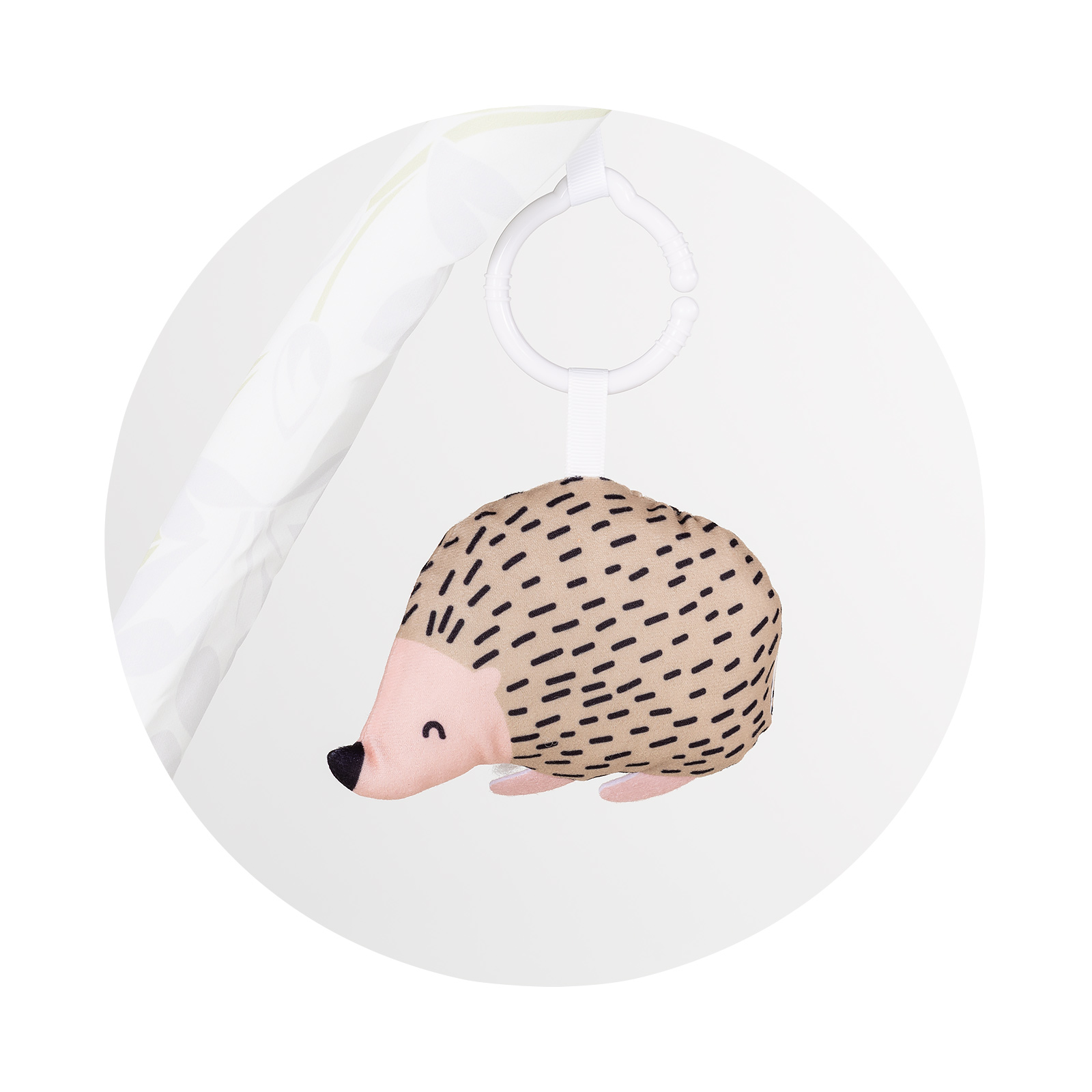 Стимулира сетивата на детето с много шарени форми, ярки цветове, звуци и различни на допир материали;