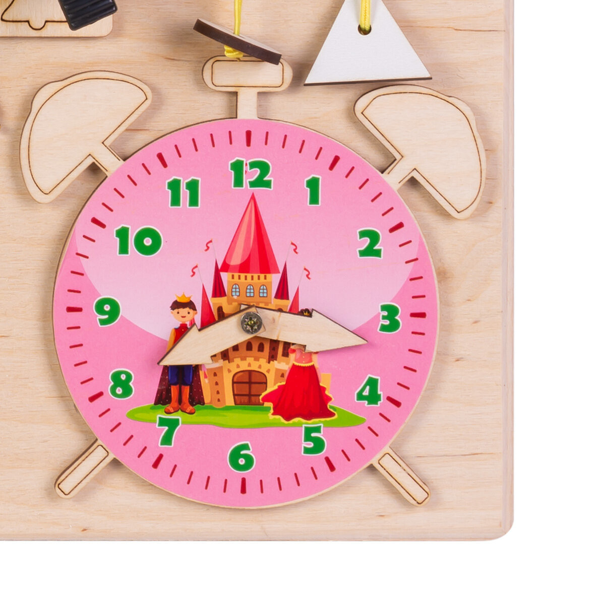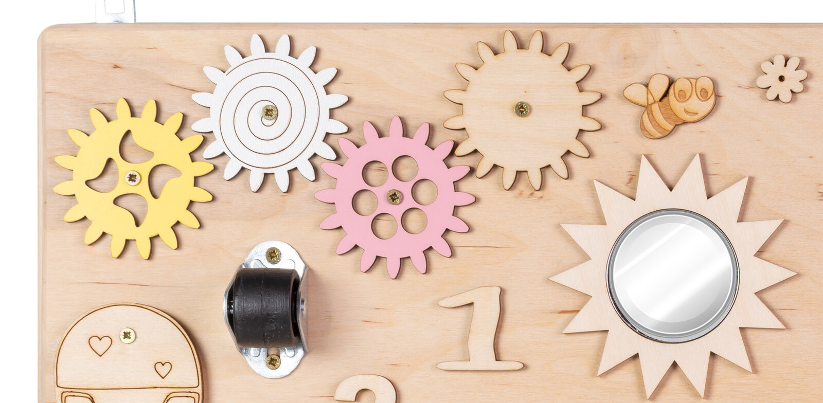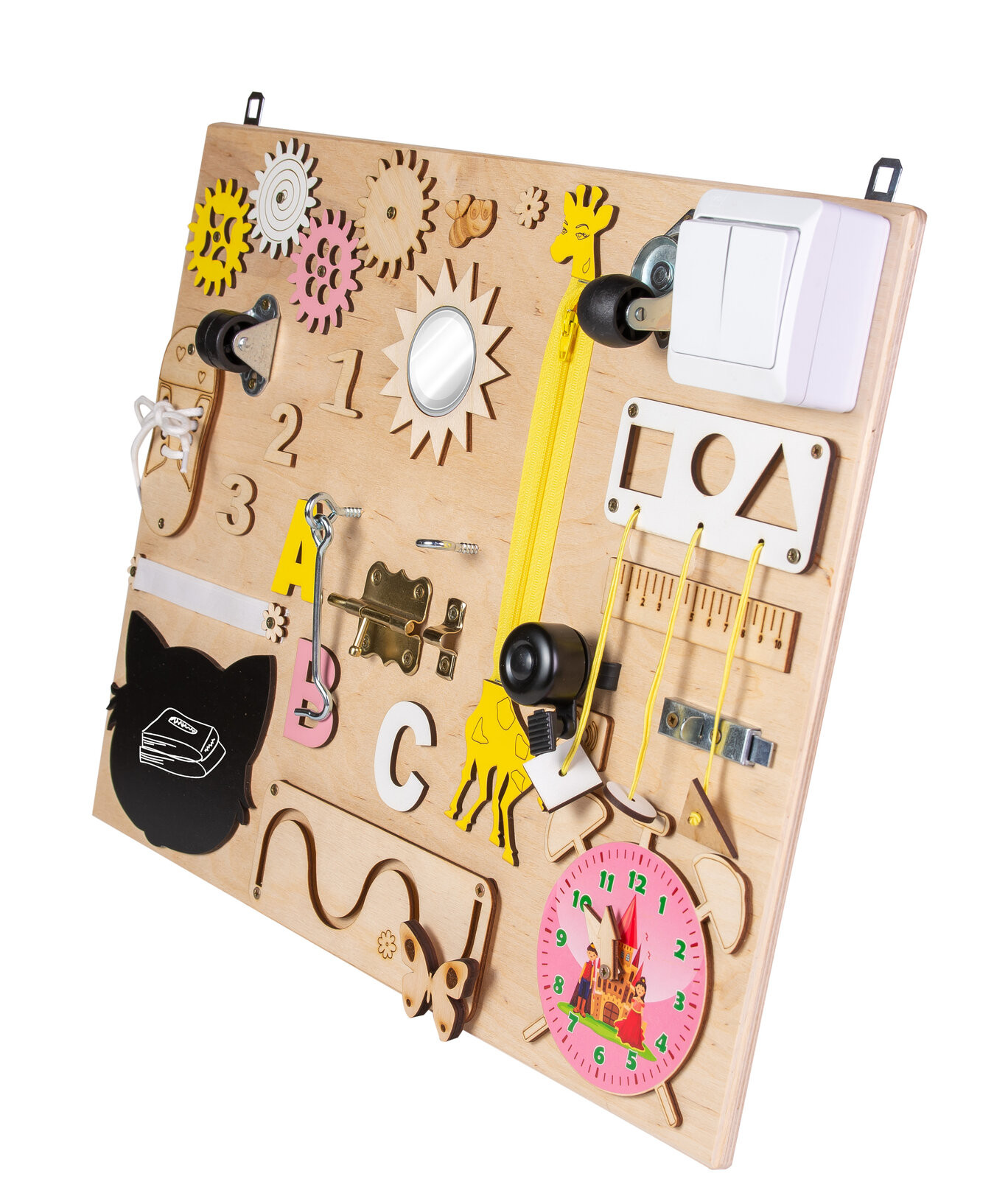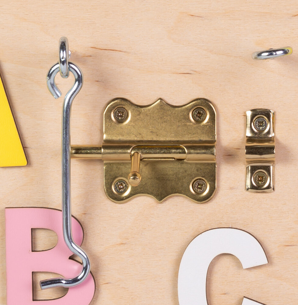 Дъската съдържа: - Многоцветни, движещи се зъбни колела; - Цип; - Въртящи се колела; - Велкро; - Два вида резета; - Часовник с движещи се стрелки; - Кука за заключване; - Ключ за лампа;