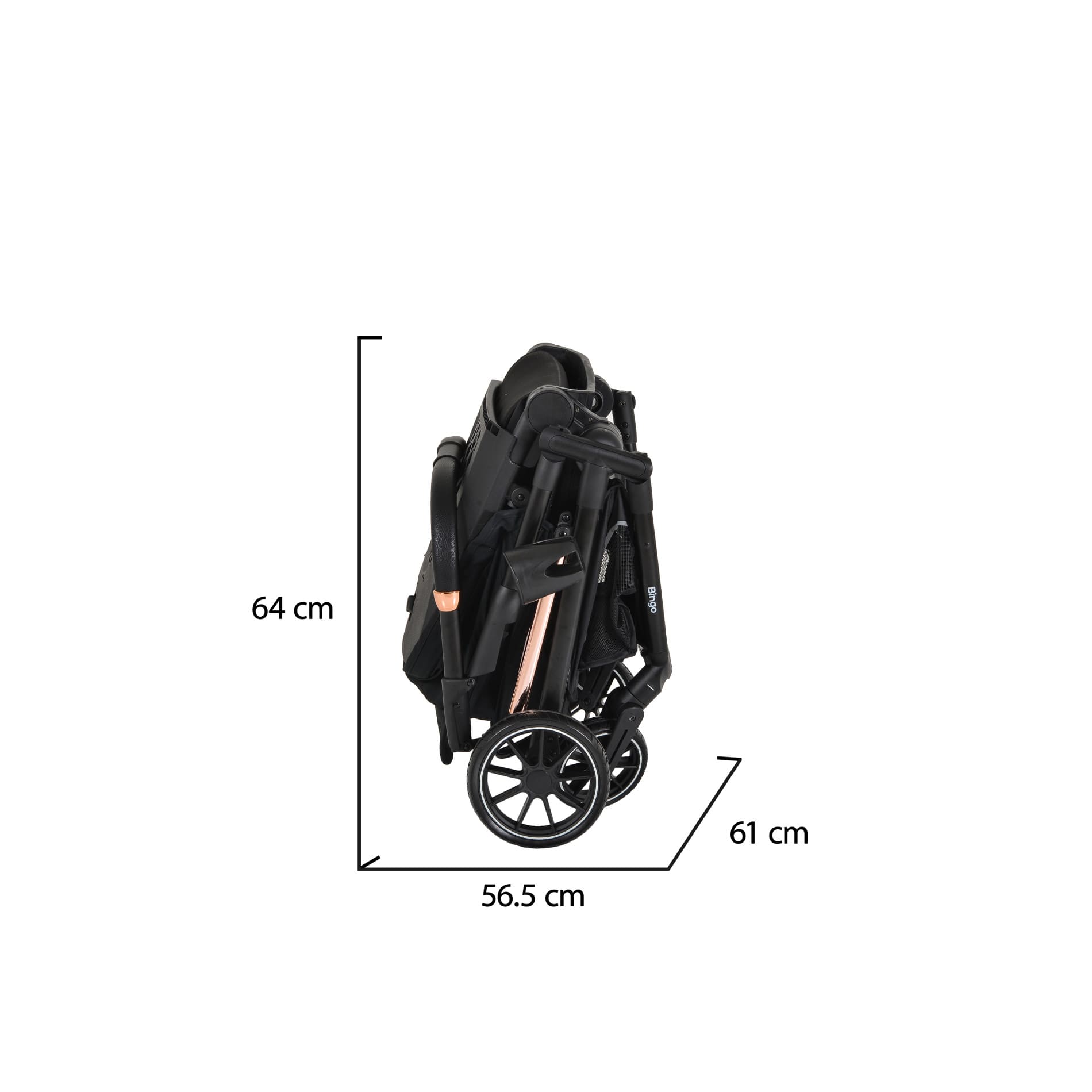 Предни колела с въртене на 360°, задни колела със свързана спирачка и амортисьори, осигуряващи допълнителен комфорт и стабилност при возене;