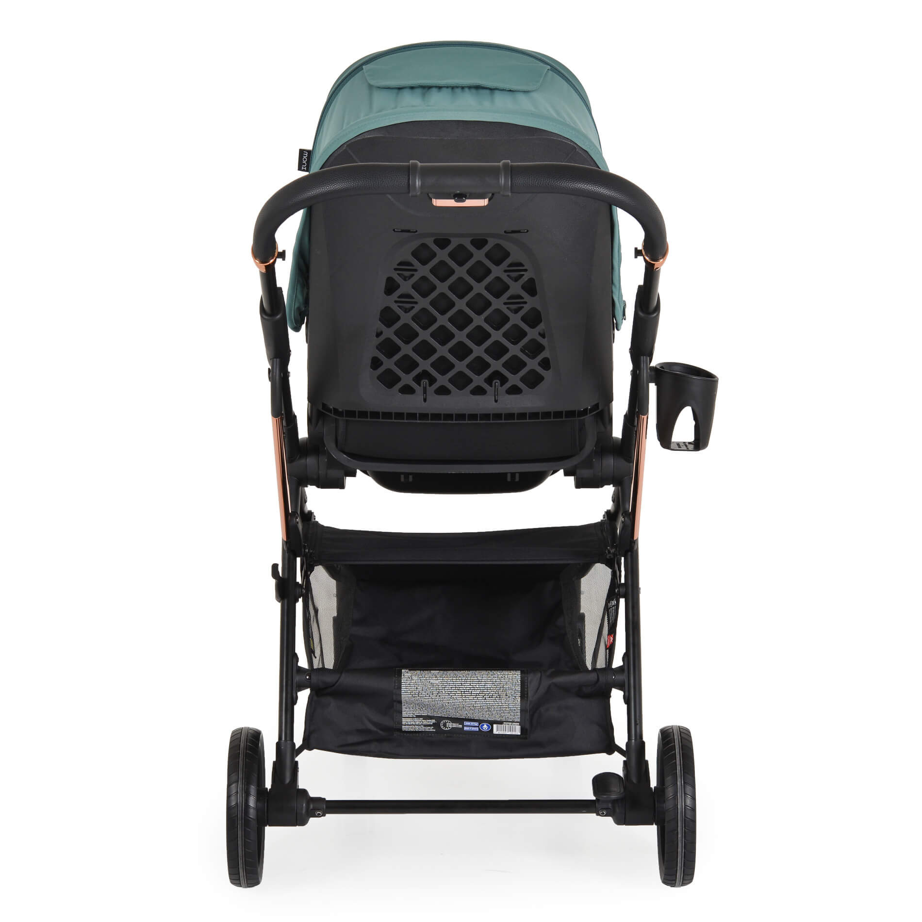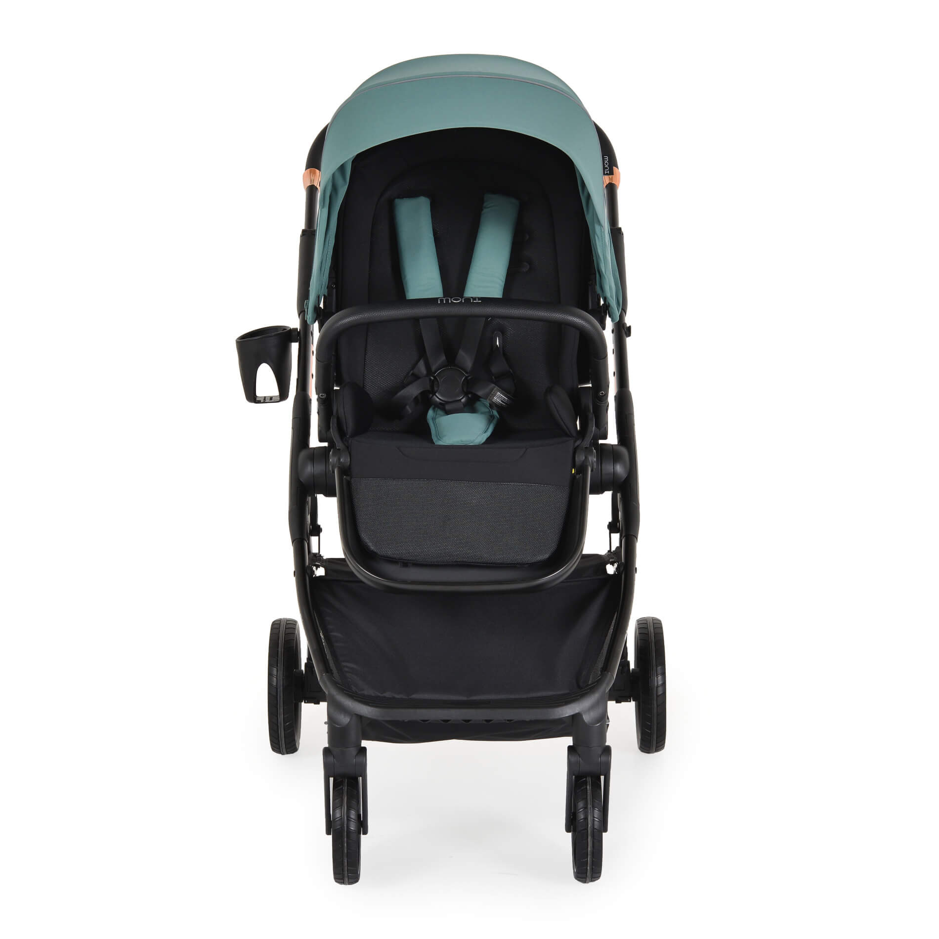 Предни колела с въртене на 360°, задни колела със свързана спирачка и амортисьори, осигуряващи допълнителен комфорт и стабилност при возене;