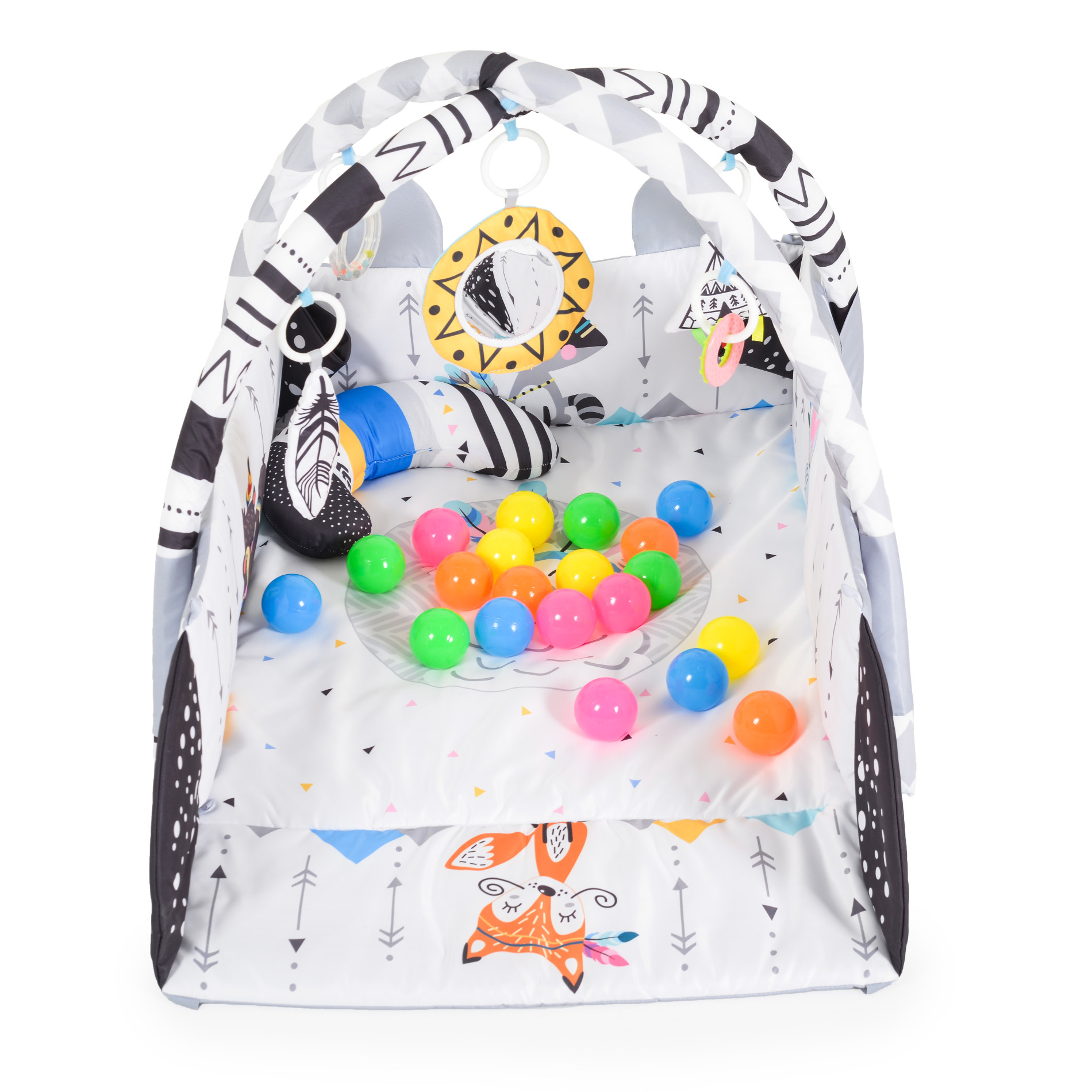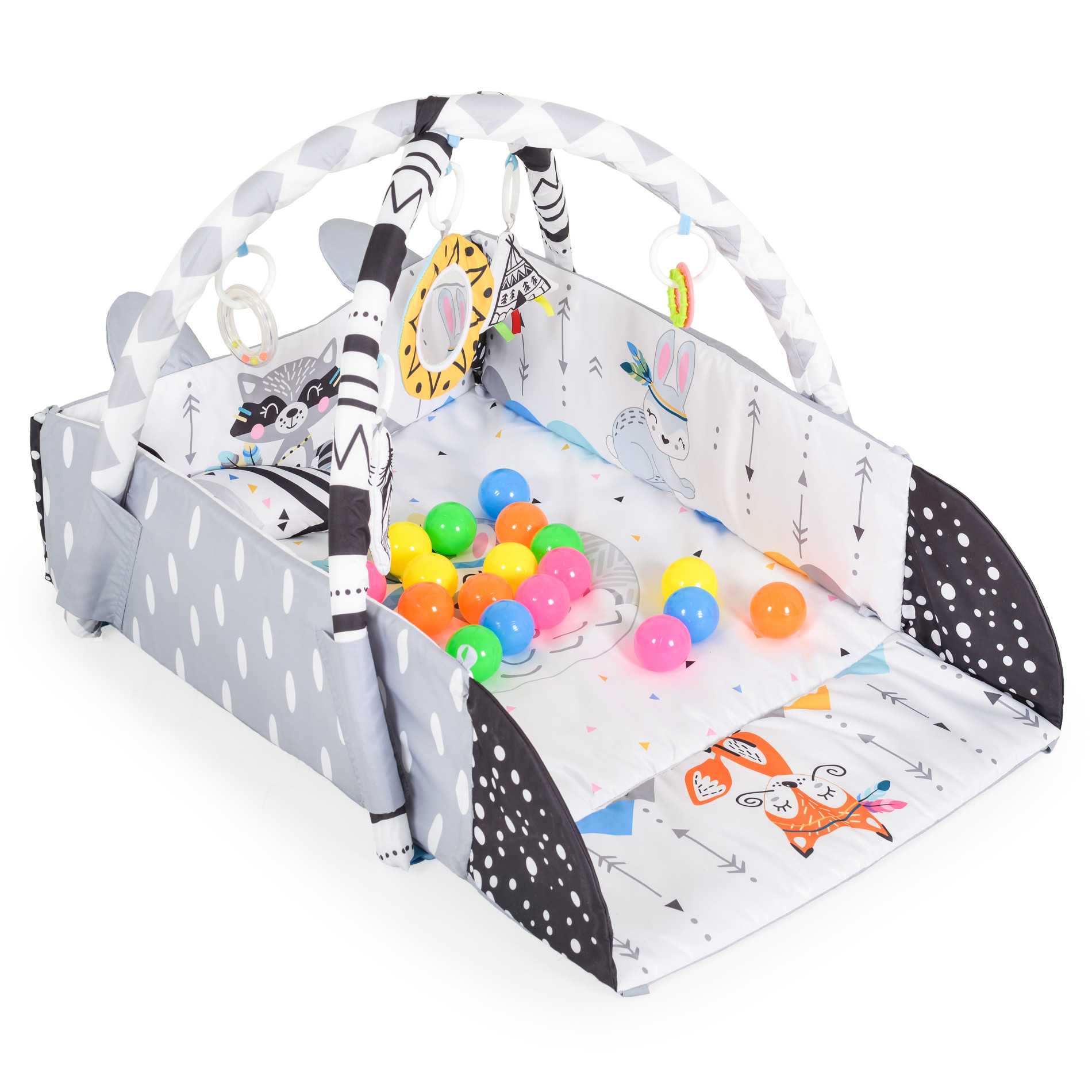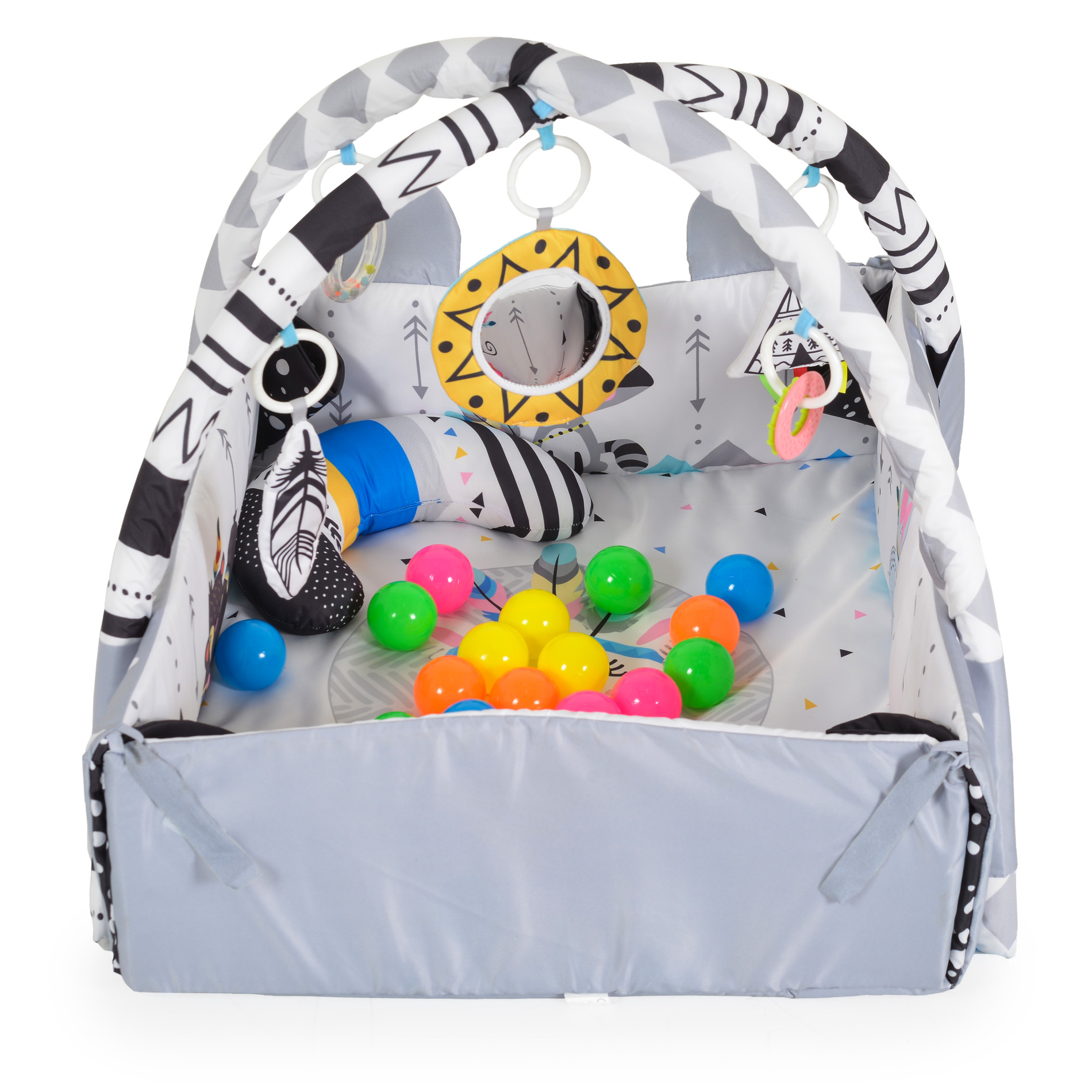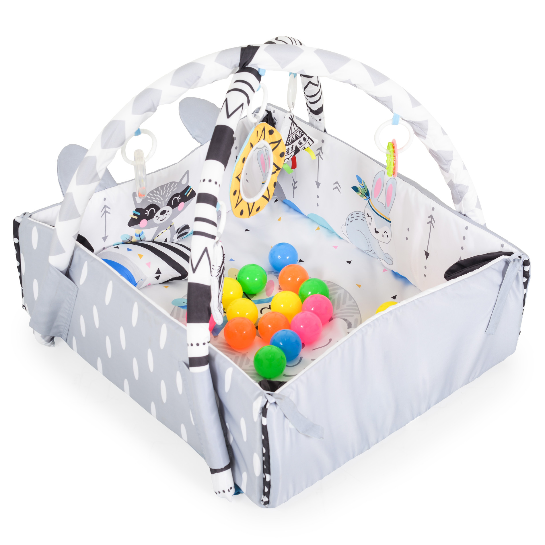 Включени в комплекта няколко висящи играчки, 20 топки за игра, възглавничка и сваляеми грифове;