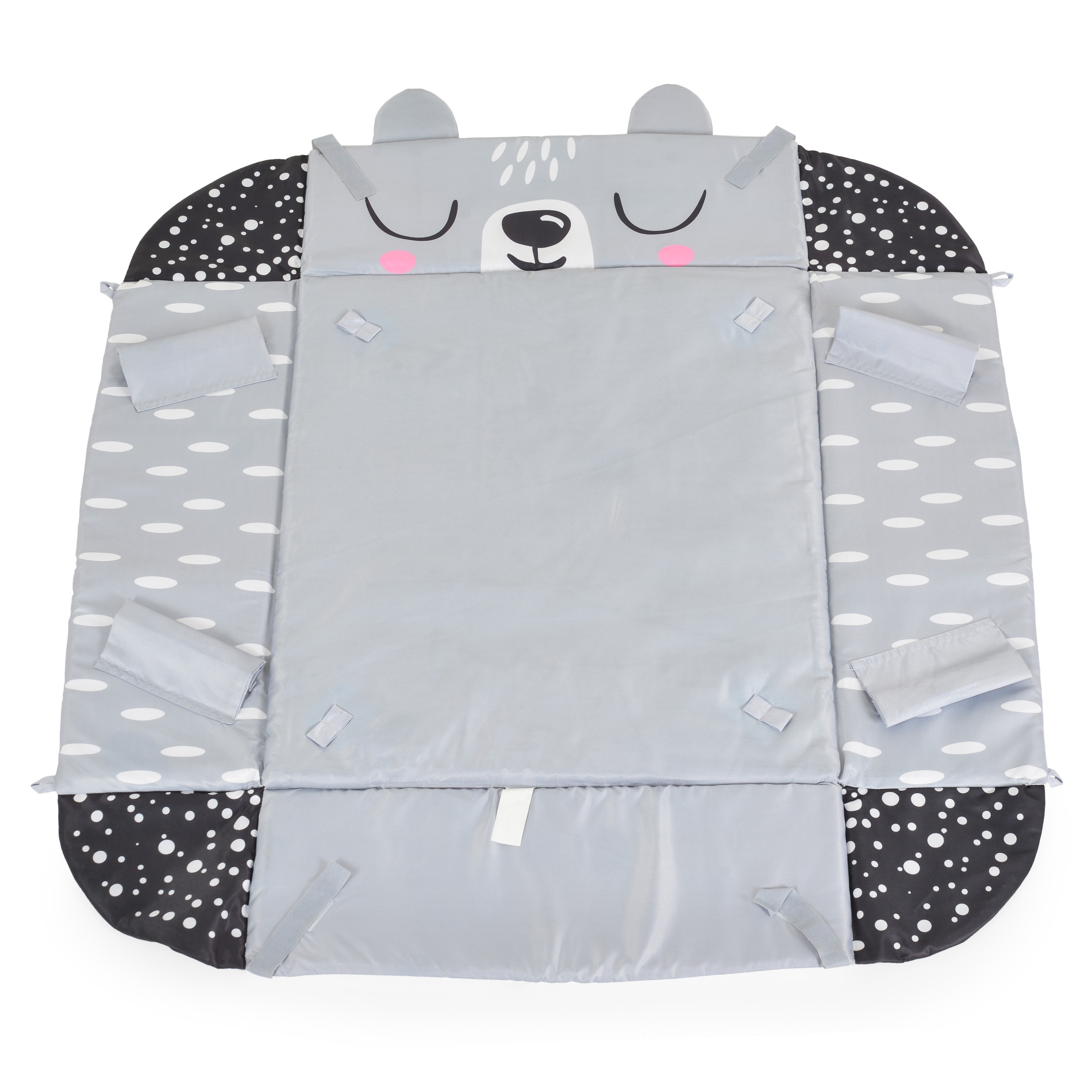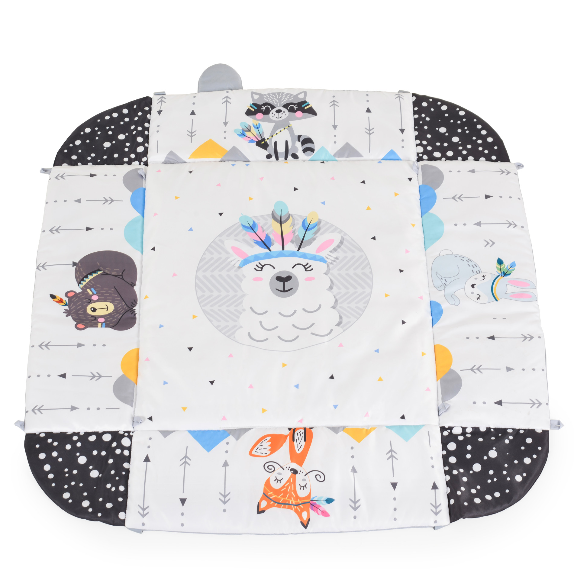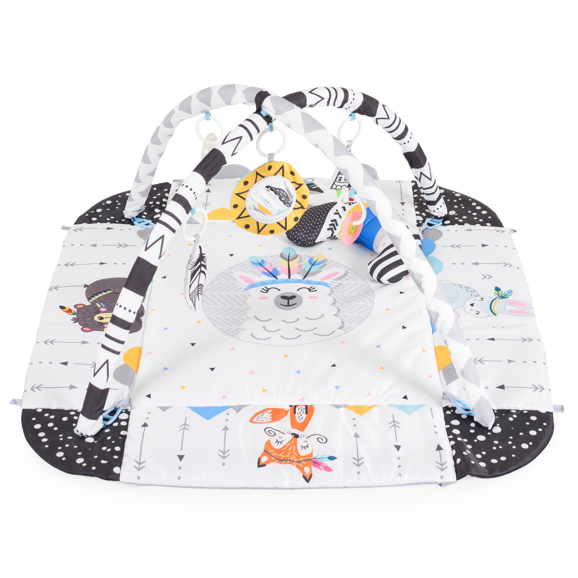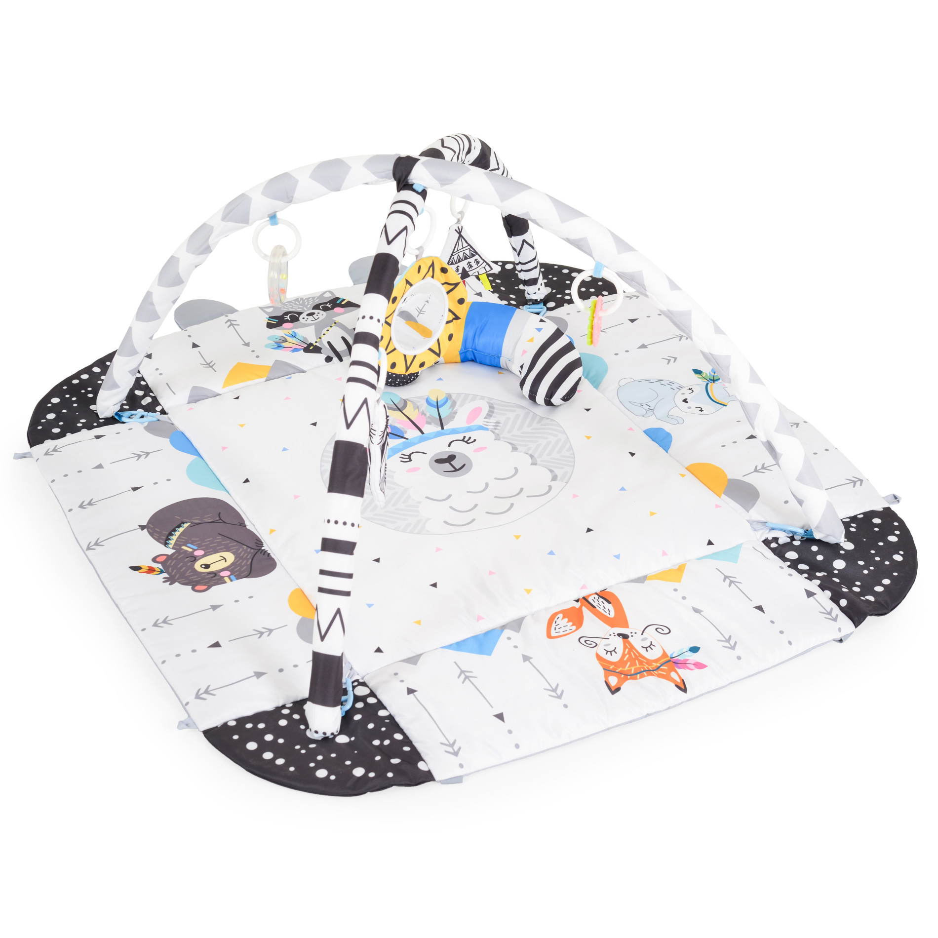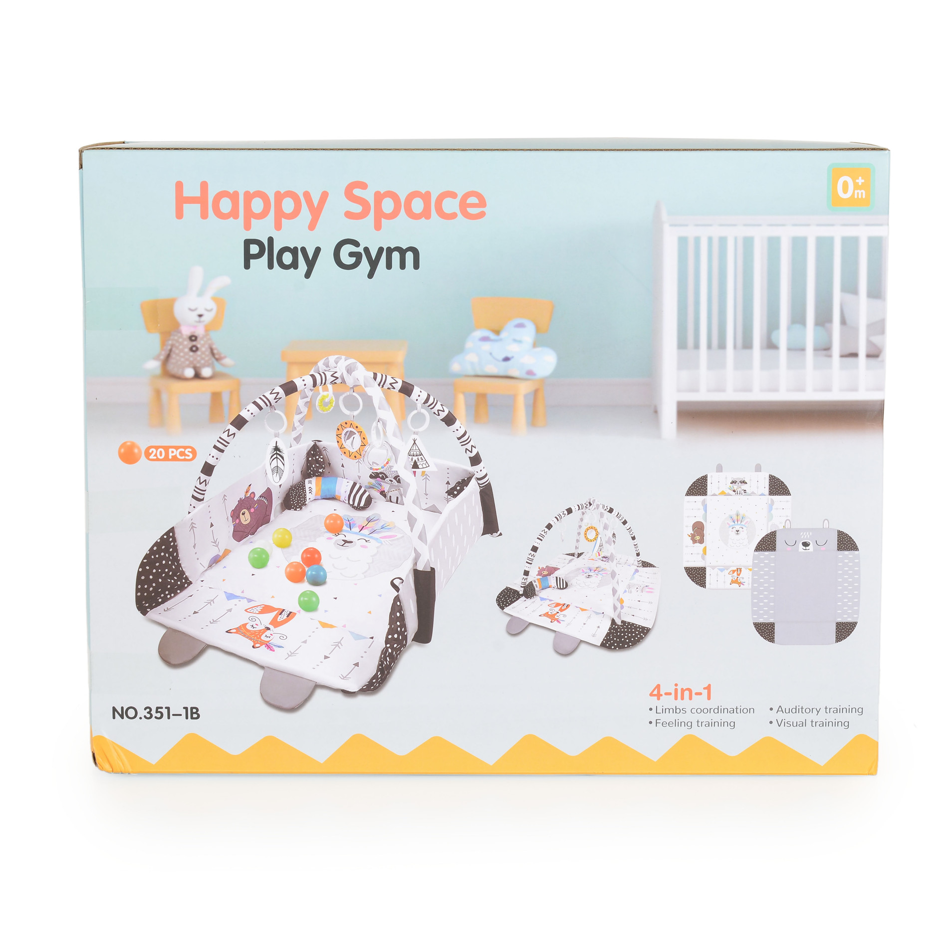 Включени в комплекта няколко висящи играчки, 20 топки за игра, възглавничка и сваляеми грифове;