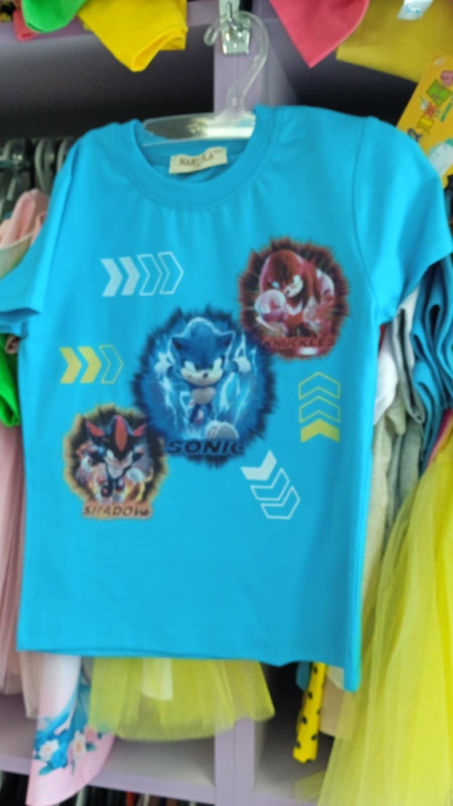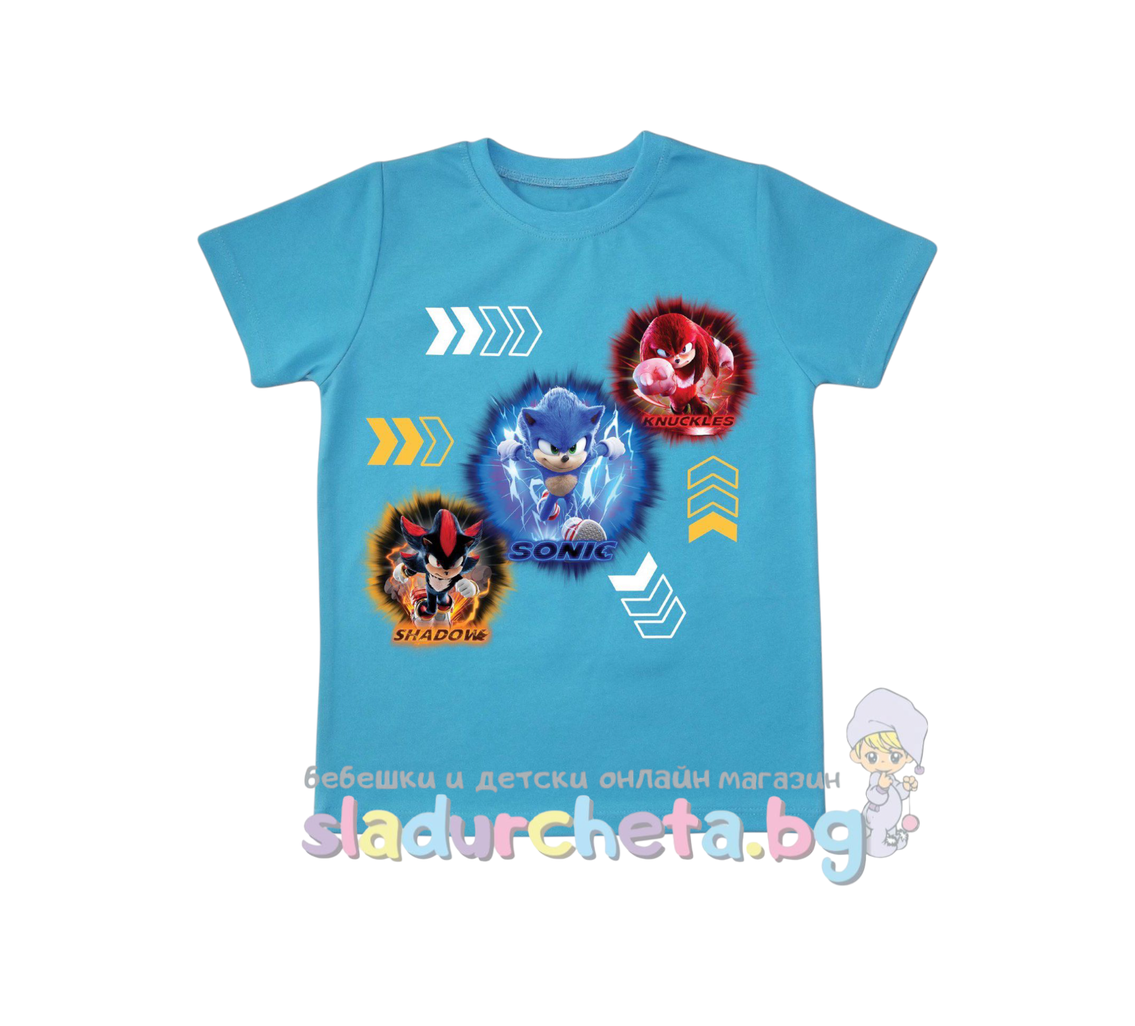 Тениската е с къс ръкав в син цвят с цветна апликация на Соник;
