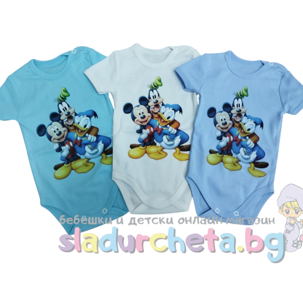 Бодито е с къс ръкав с цветна апликация на Мики Маус;