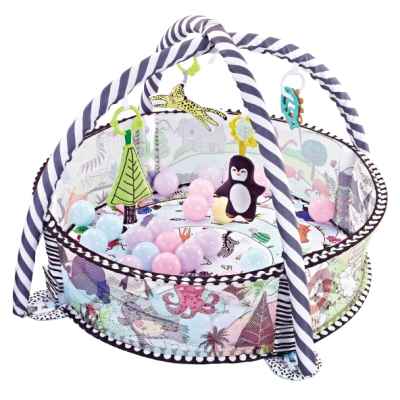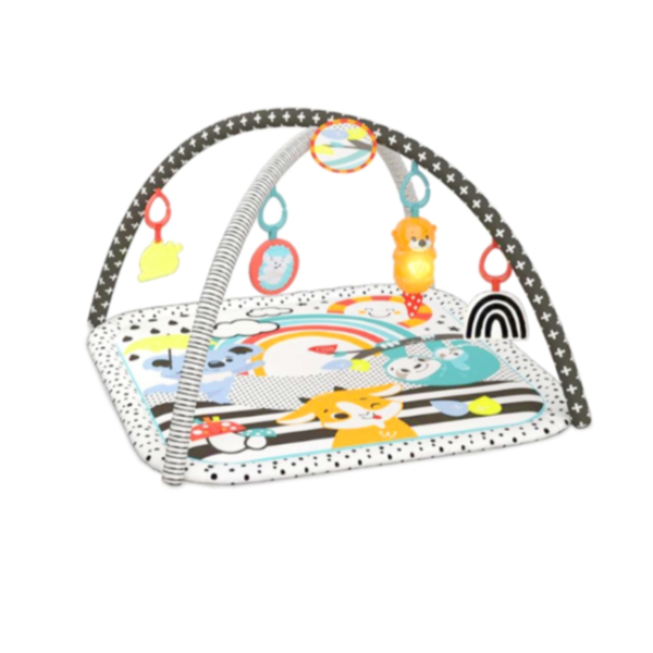 Включва 5 бебешки играчки: музикална и светеща видра с мека опашка, огледало за самооткриване, мека играчка таралеж с дрънкалка, гризалка охлюв без BPA и двустранна играчка дъга;