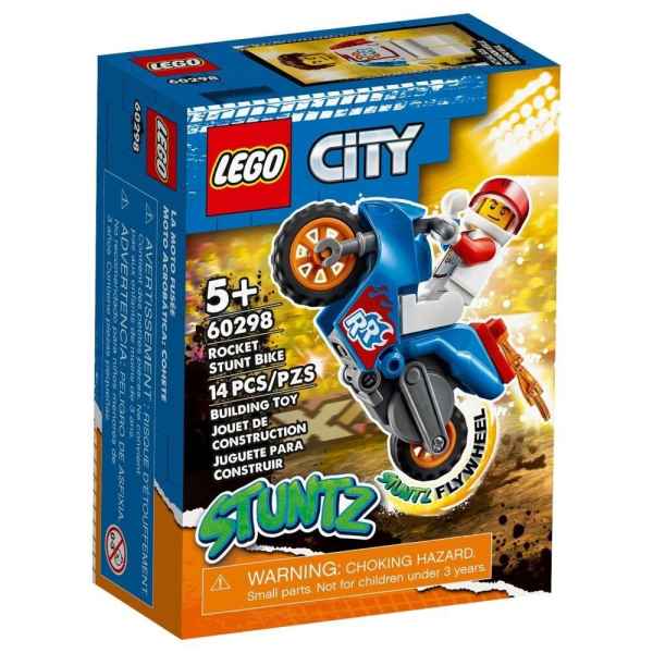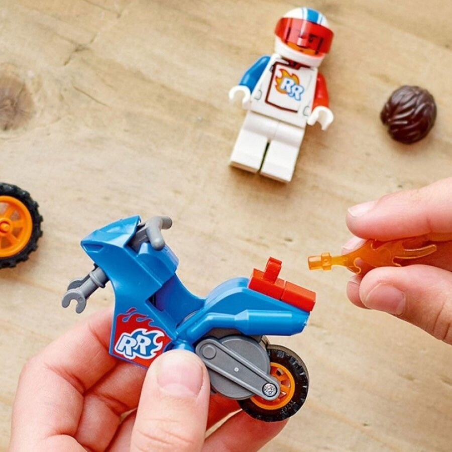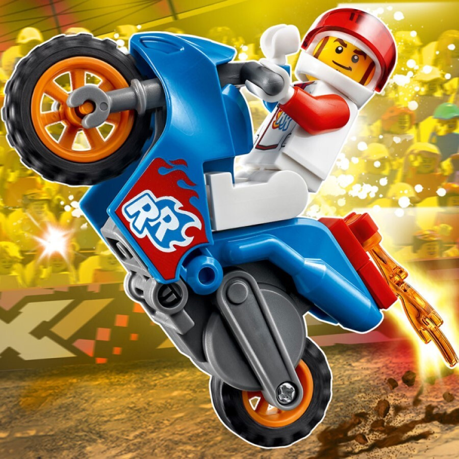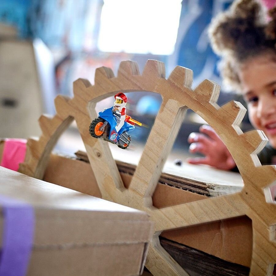 Комплектът включва каскадьорски мотоциклет, задвижван от маховик и минифигурка на ездач;