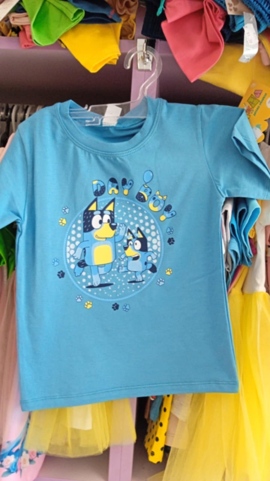 Тениската е с къси ръкави в син цвят с апликация на Блуи;