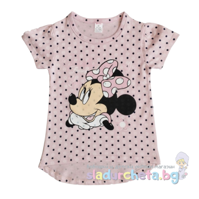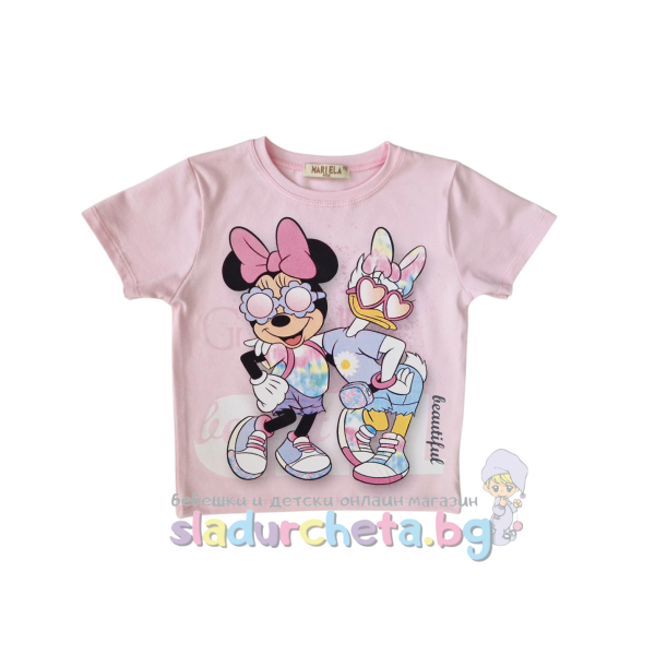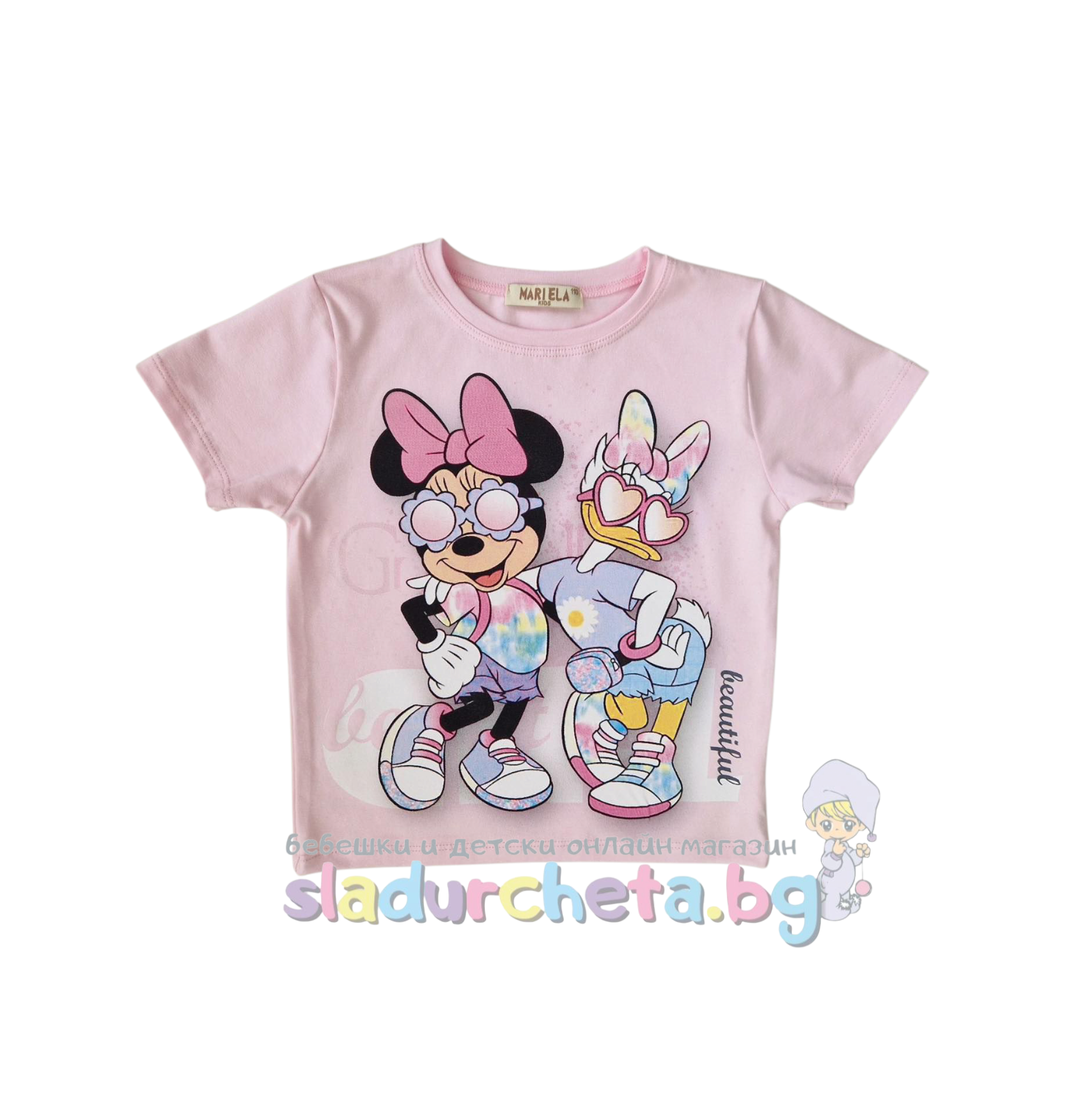 Тениската е с къси ръкави в розов цвят с цветна апликация на Мини Маус;