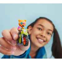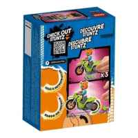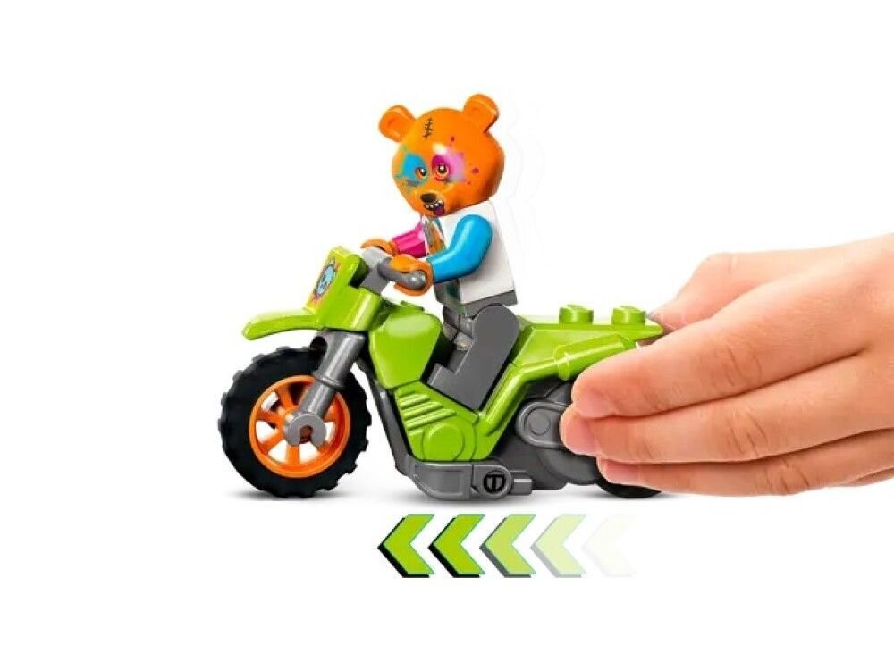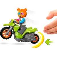 Комплектът включва каскадьорски мотоциклет, задвижван от маховик и минифигурка на ездач;