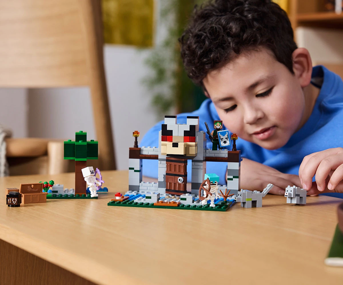 Комплект за приключения LEGO® Minecraft® за деца – момчетата и момичетата на възраст над 8 години, увлечени по Minecraft, могат да се забавляват, като изследват крепостта и гората с творческата играчка за построяване „Вълчата крепост“;