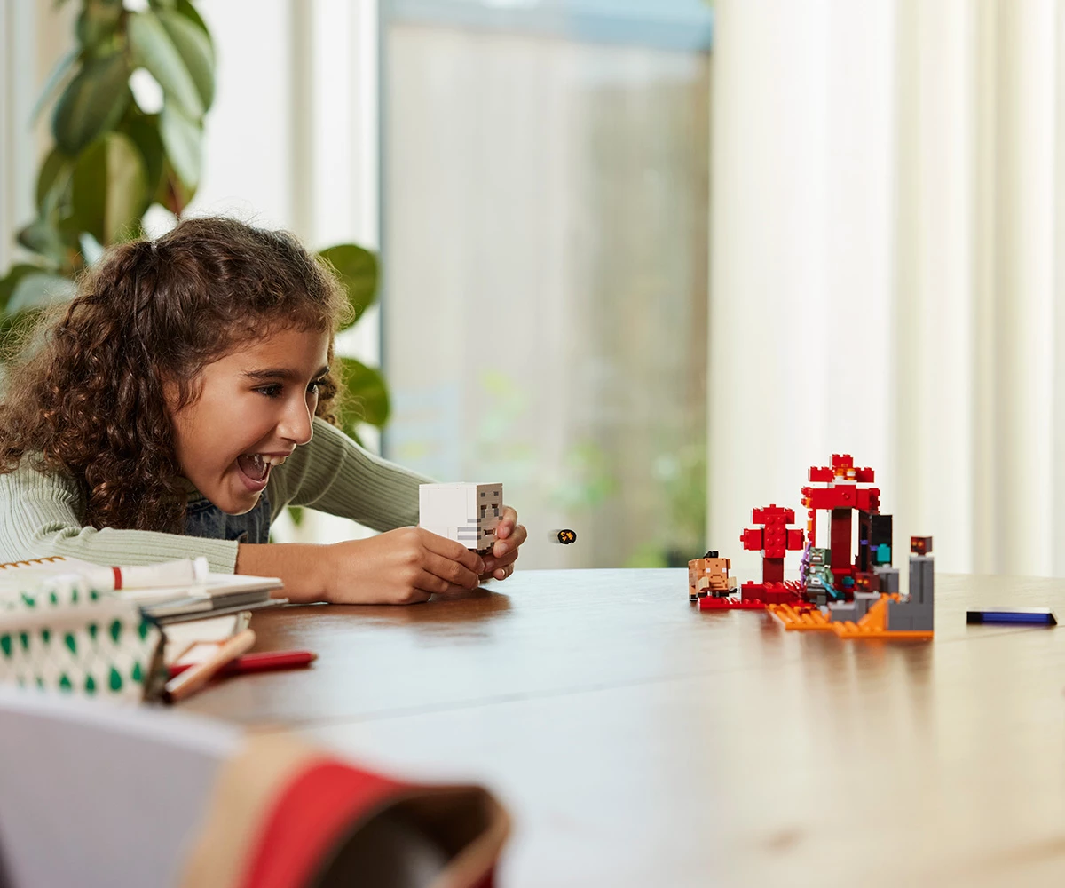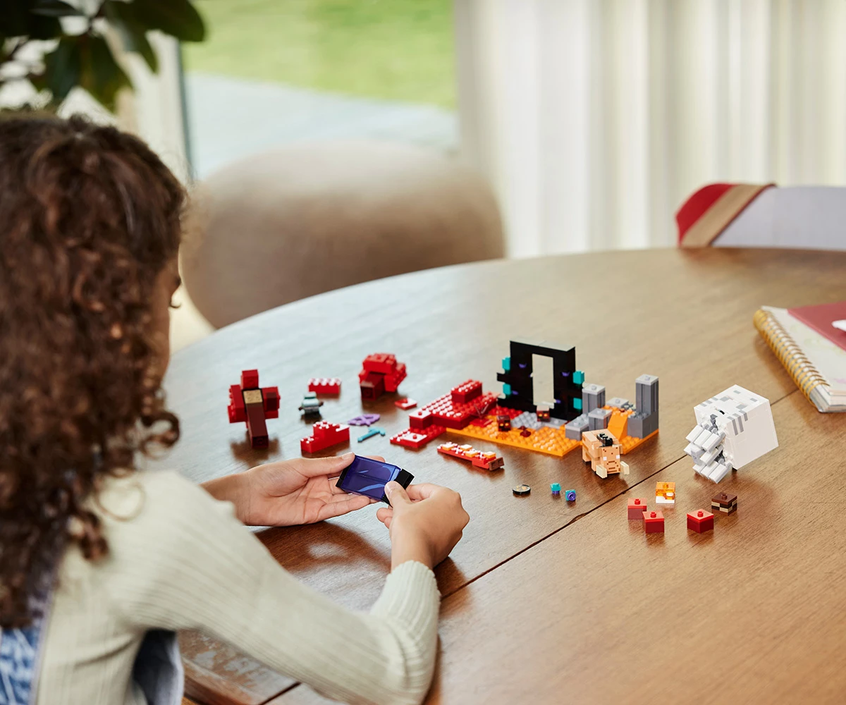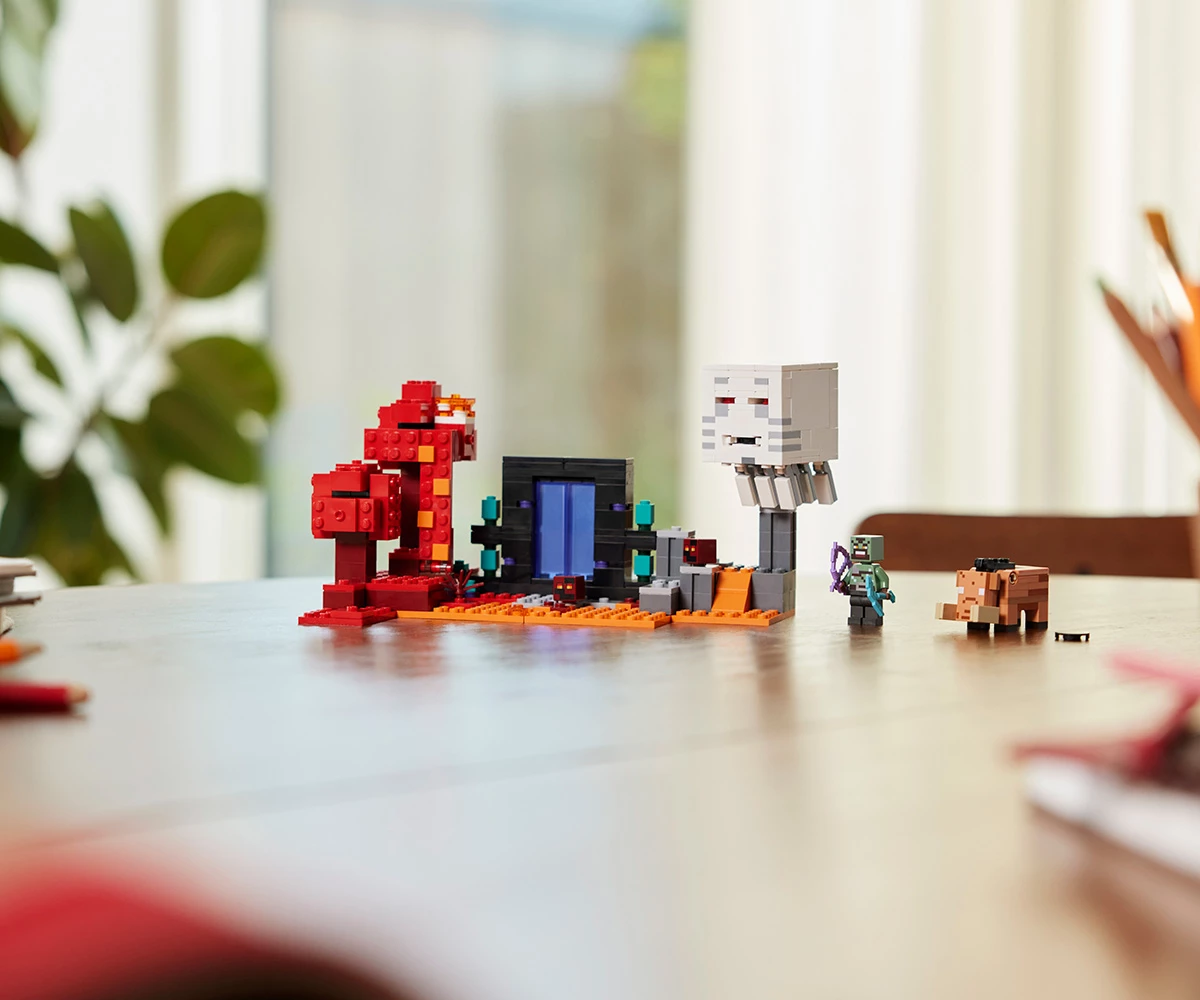 Kомплектът играчки с портала към Ада от Minecraft® е идея за подарък за феновете на Minecraft и играчките за построяване LEGO®;