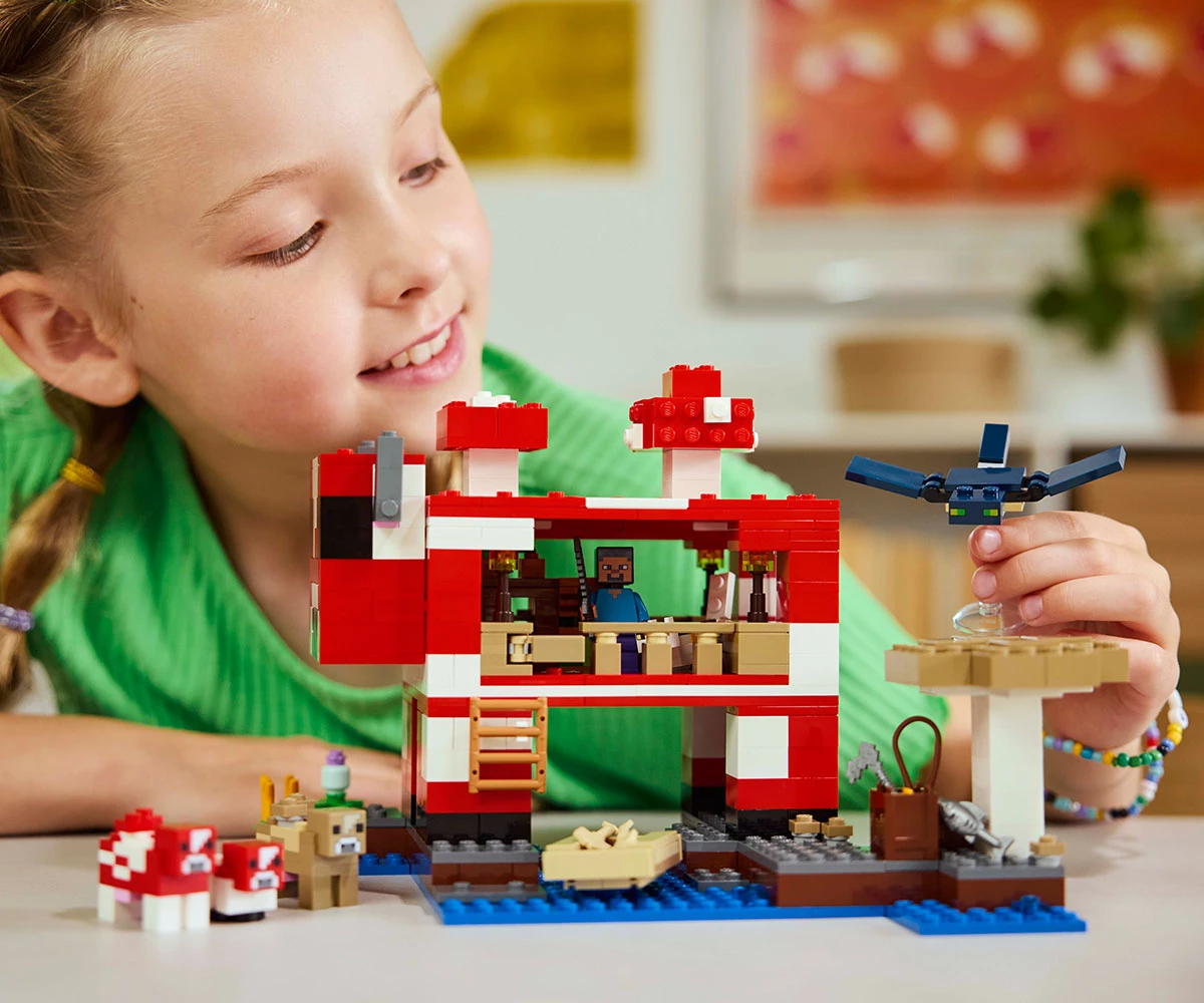 Гейминг комплект LEGO® Minecraft® за деца – „Къщата на Муухоморка“ има много елементи и герои, на които ще се зарадват момичета и момчета;