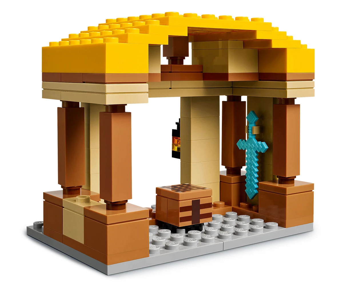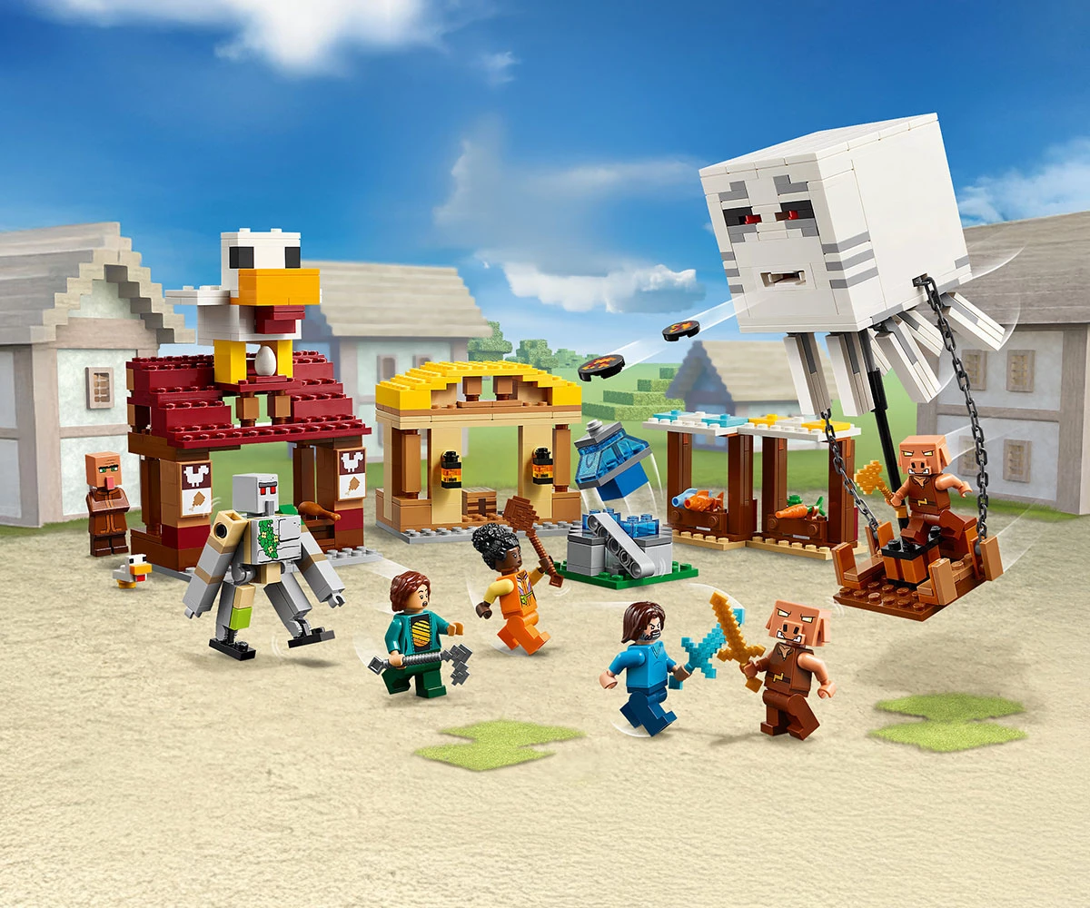 Фигури Minecraft® – този комплект от видеоигри включва минифигури на Стив, Натали, Даун и селянин, плюс огнен призрак-балон, малко пиле, 2 пиглина и подвижна фигура на железен голем;