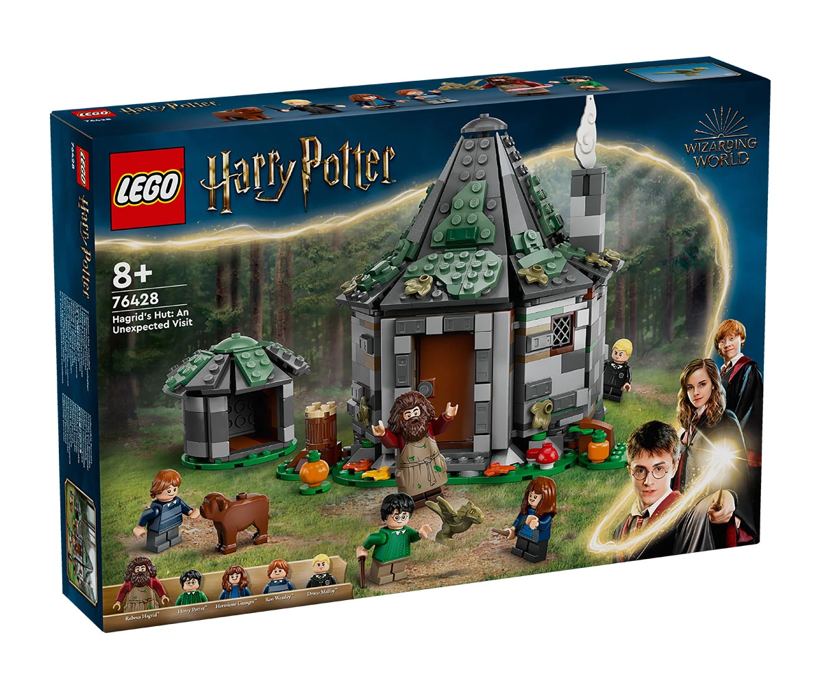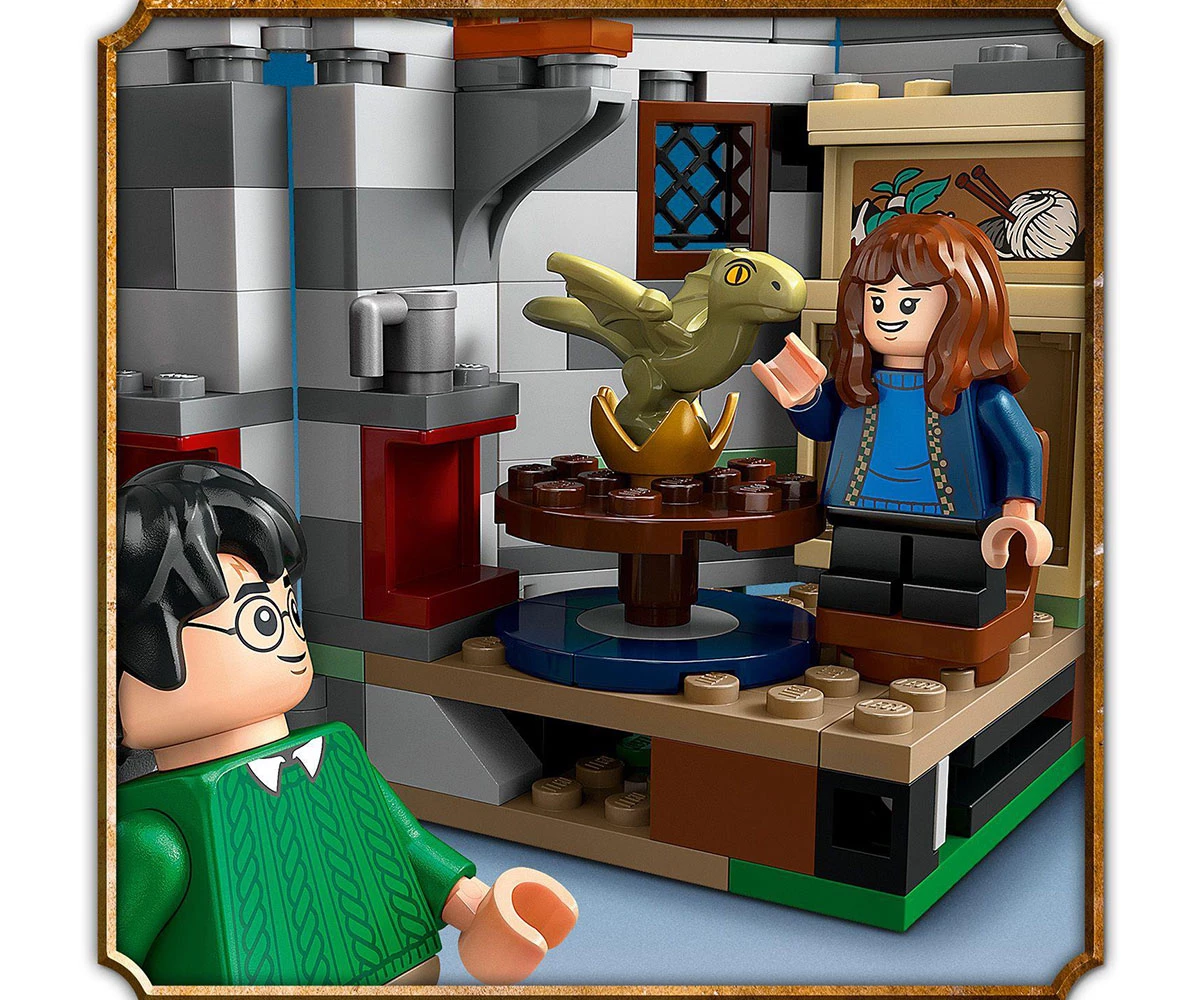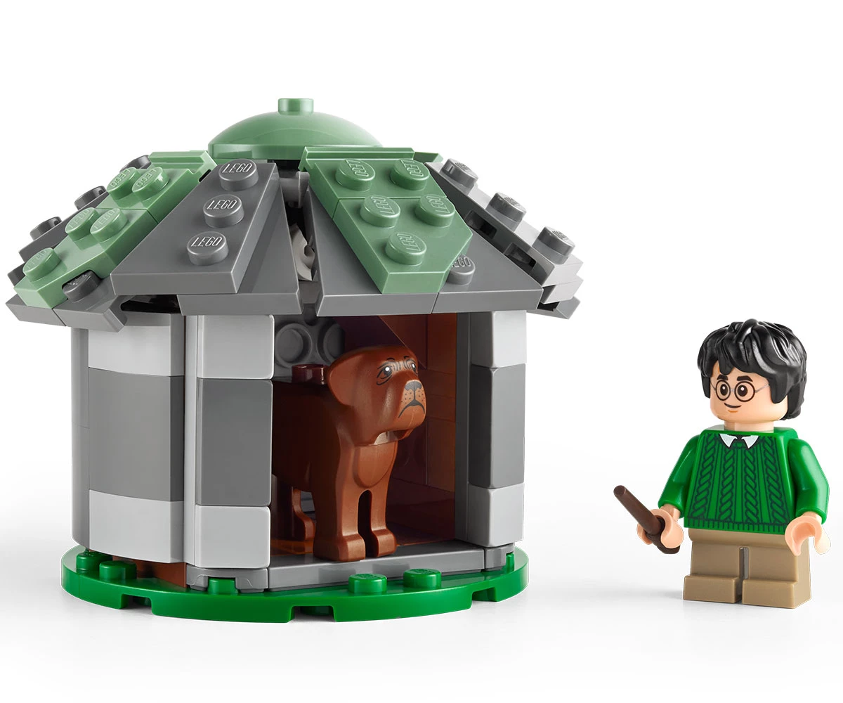 Колиба и кучешка колиба за конструиране – колибата има подвижен покрив и се отваря за лесна игра, а детайлният интериор включва сгъваемия стол на Хагрид, стойка за чадър и драконово яйце;
