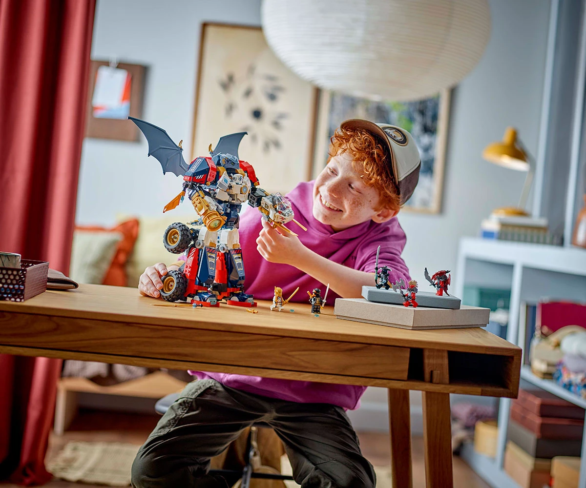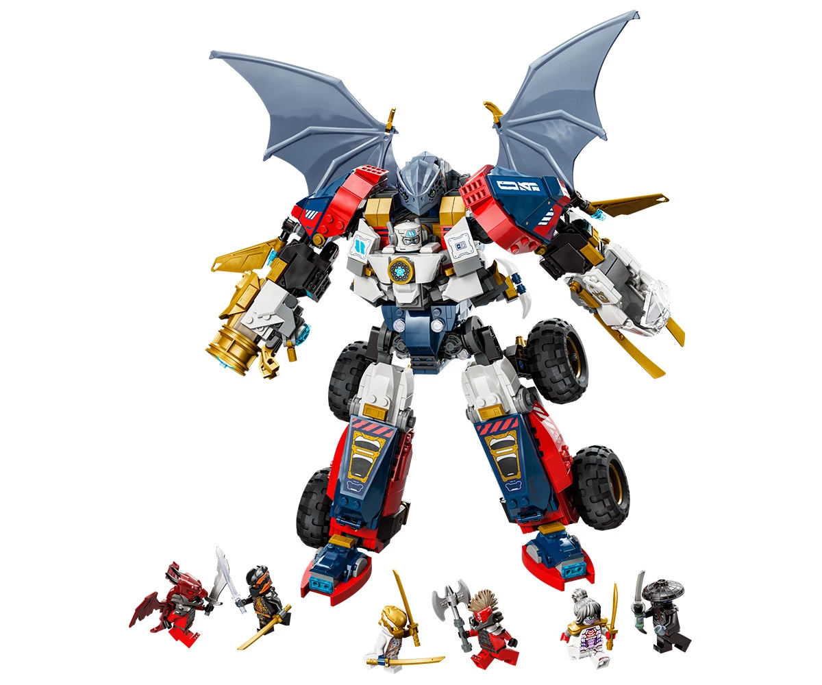 Подвижна играчка NINJAGO® – големият робот-комбинатор има подвижни крака, стъпала, ръце, китки, пръсти и глава, плюс драконови крила, кабина, 2 оръдия и голям меч;