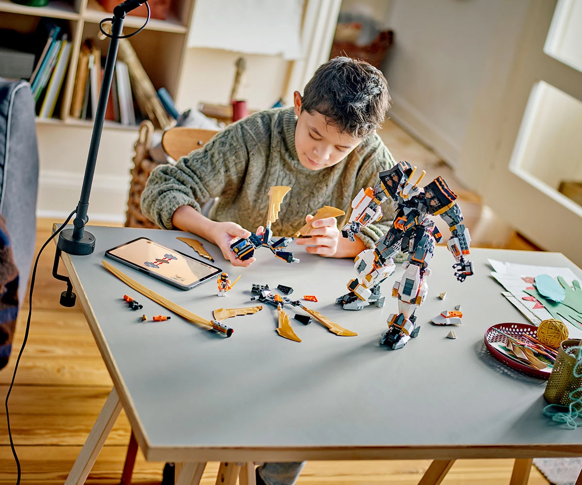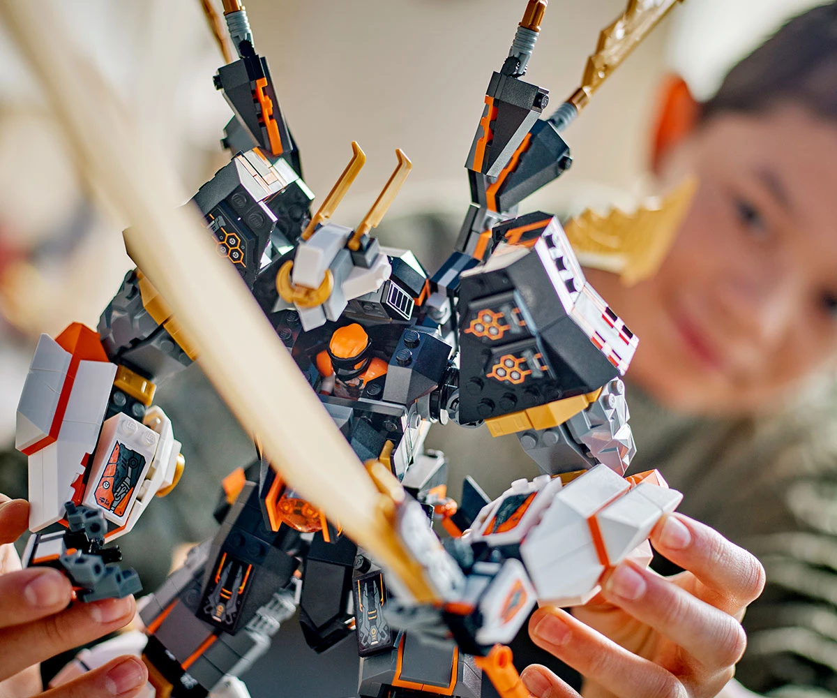 Изпълнена с екшън играчка с робот за деца – момчета и момичета над 12 години могат да разиграват битки от сезон 2 на ТВ сериала NINJAGO® Dragons Rising с драконовия робот-титан на Коул;