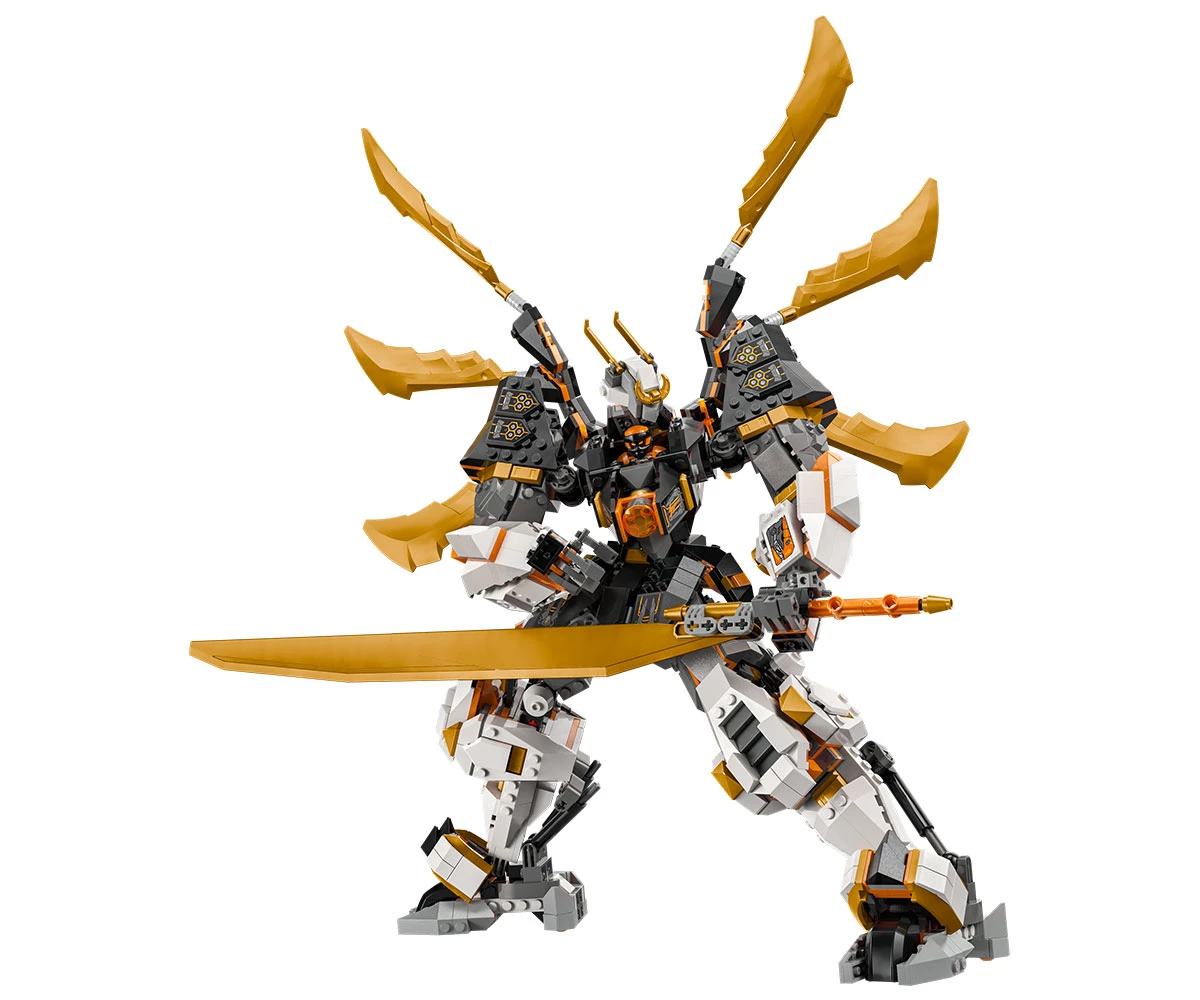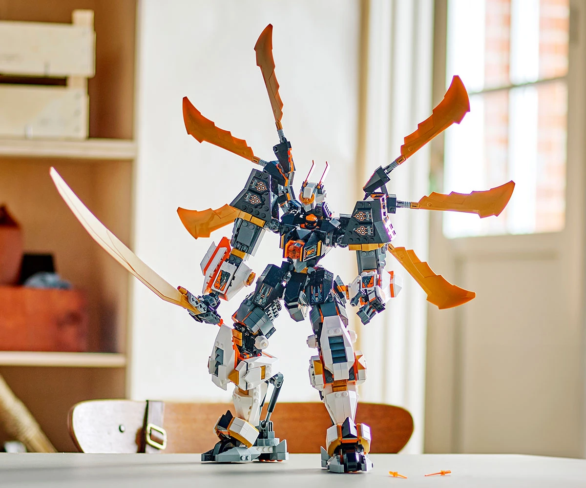 1 минифигура NINJAGO® – комплектът за игра с нинджи се предлага с робот Коул, въоръжен с 2 златни мечове катана;