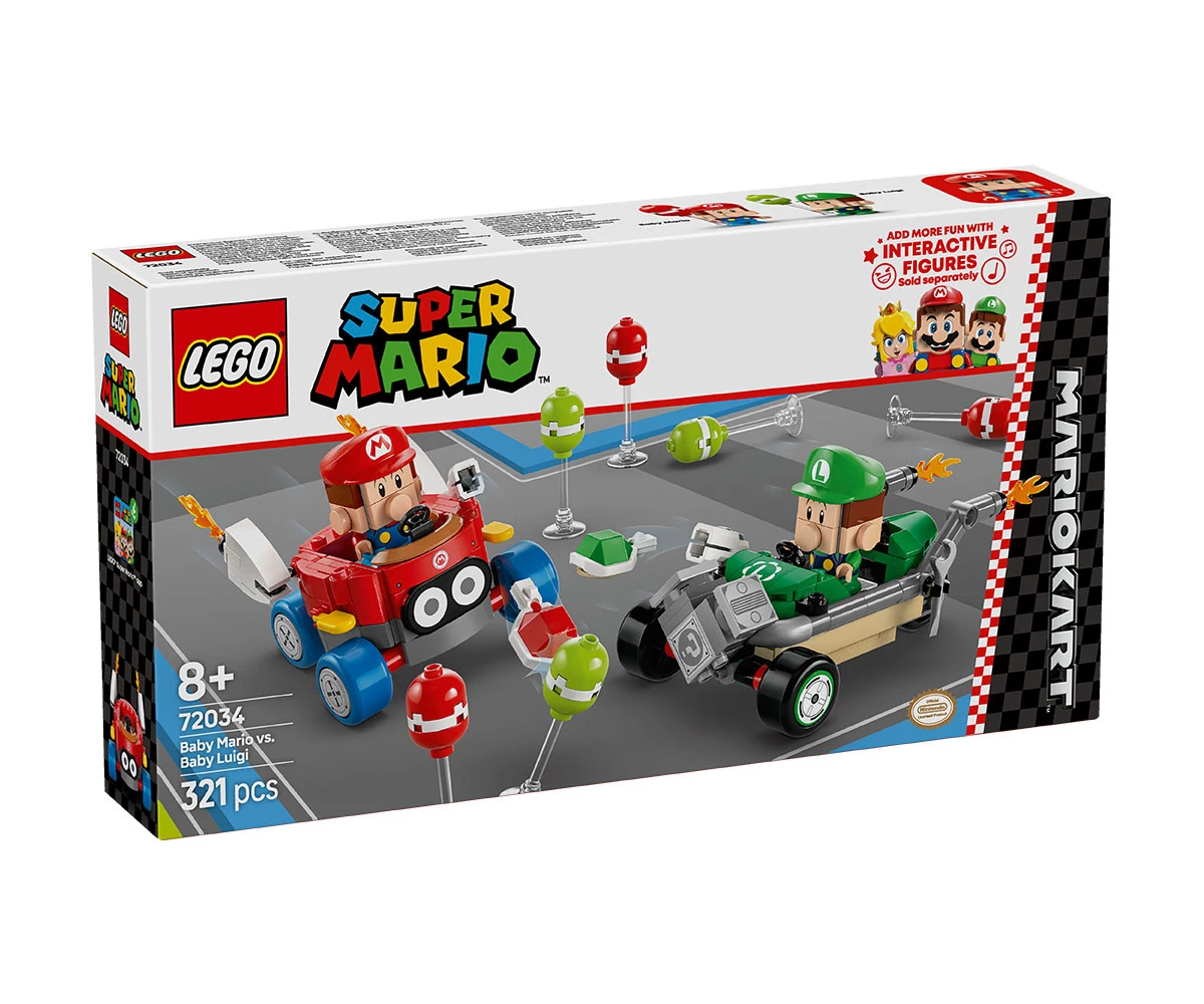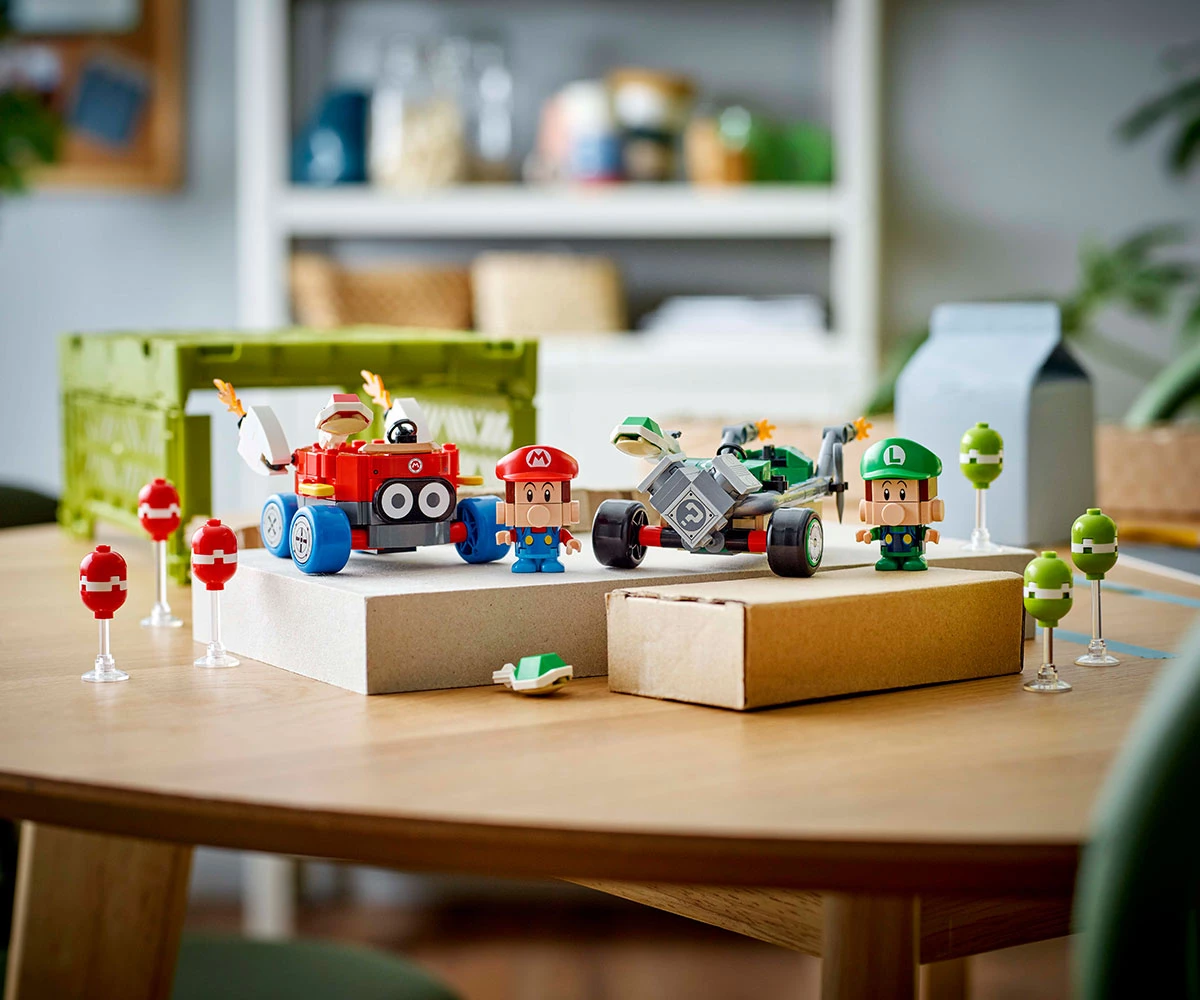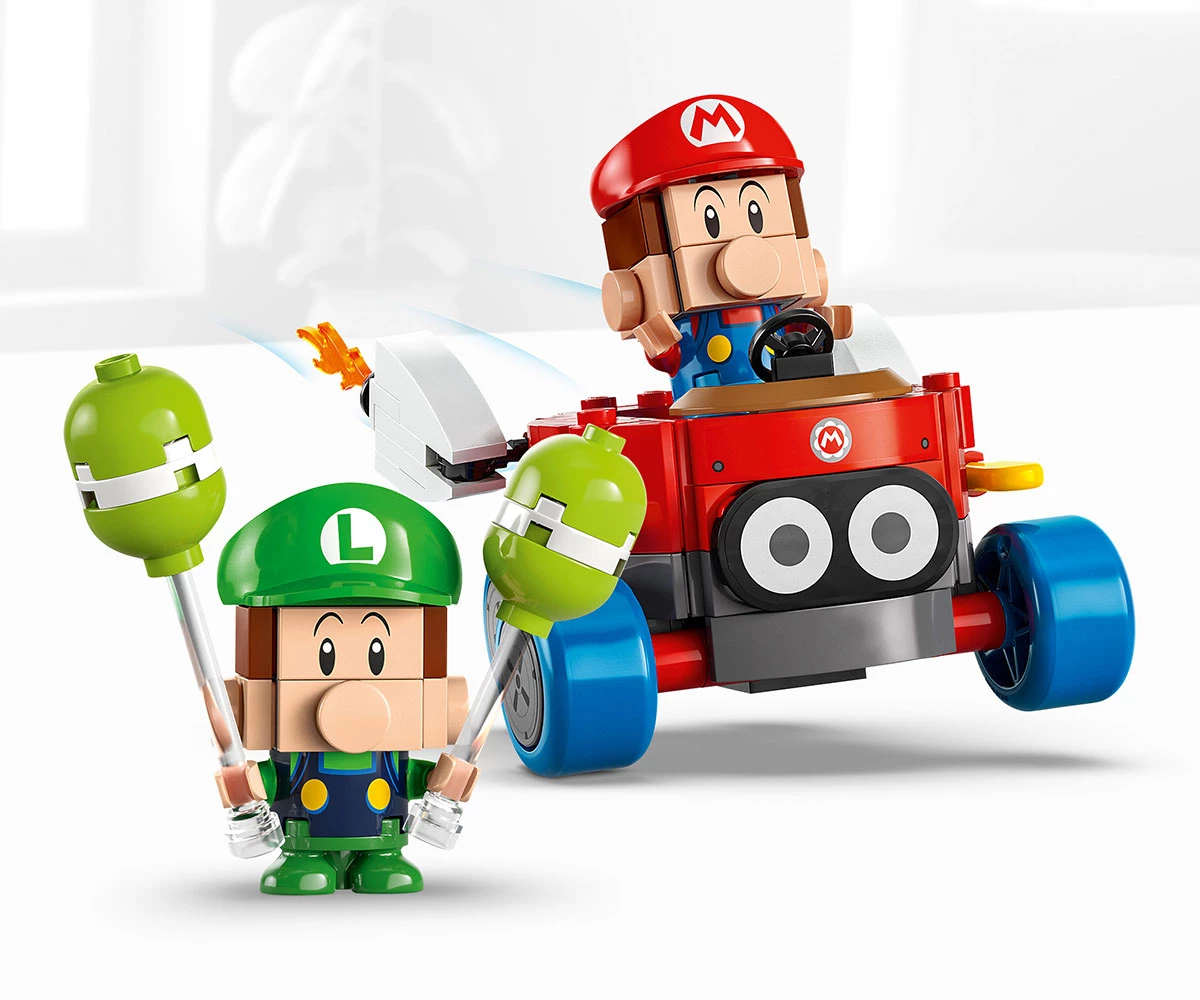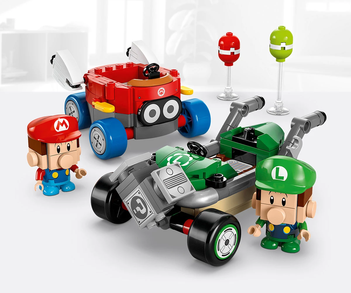 Комплект от тухлички Mario Kart™ – обединете сили с Baby Mario или Baby Luigi за битки с балони и състезателен екшън с този приключенски комплект за игра LEGO® Super Mario™;