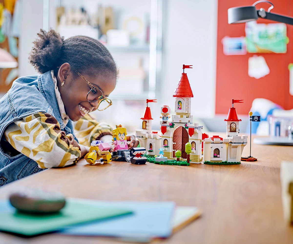 Забавен комплект играчки с герои на Nintendo® за деца - Разгледайте замъка на принцесата, играйте по роли като герои на Super Mario™, водете битка с Рой и други с този комплект LEGO® Super Mario™ Замъка на Peach;